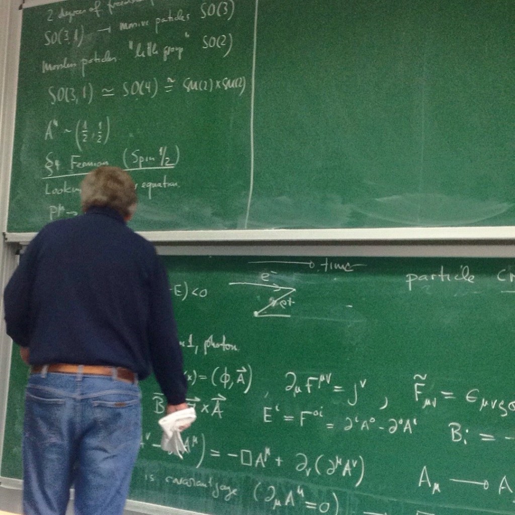 Es interesante ver cómo acostumbran los alemanes a dar sus clases. Lo primero que se ve entrando al salón es un pizarrón verde o negro, lo cual no se usa en mi universidad de origen. Y después viene lo que se escribe sobre él. La verdad nunca llevé un curso de teoría cuántica de campos o partículas en mi bachelor por lo que la mayoría de lo que está escrito en la foto no lo entendía. En la foto está Hans-Peter Nilles y fue el último curso que impartió.