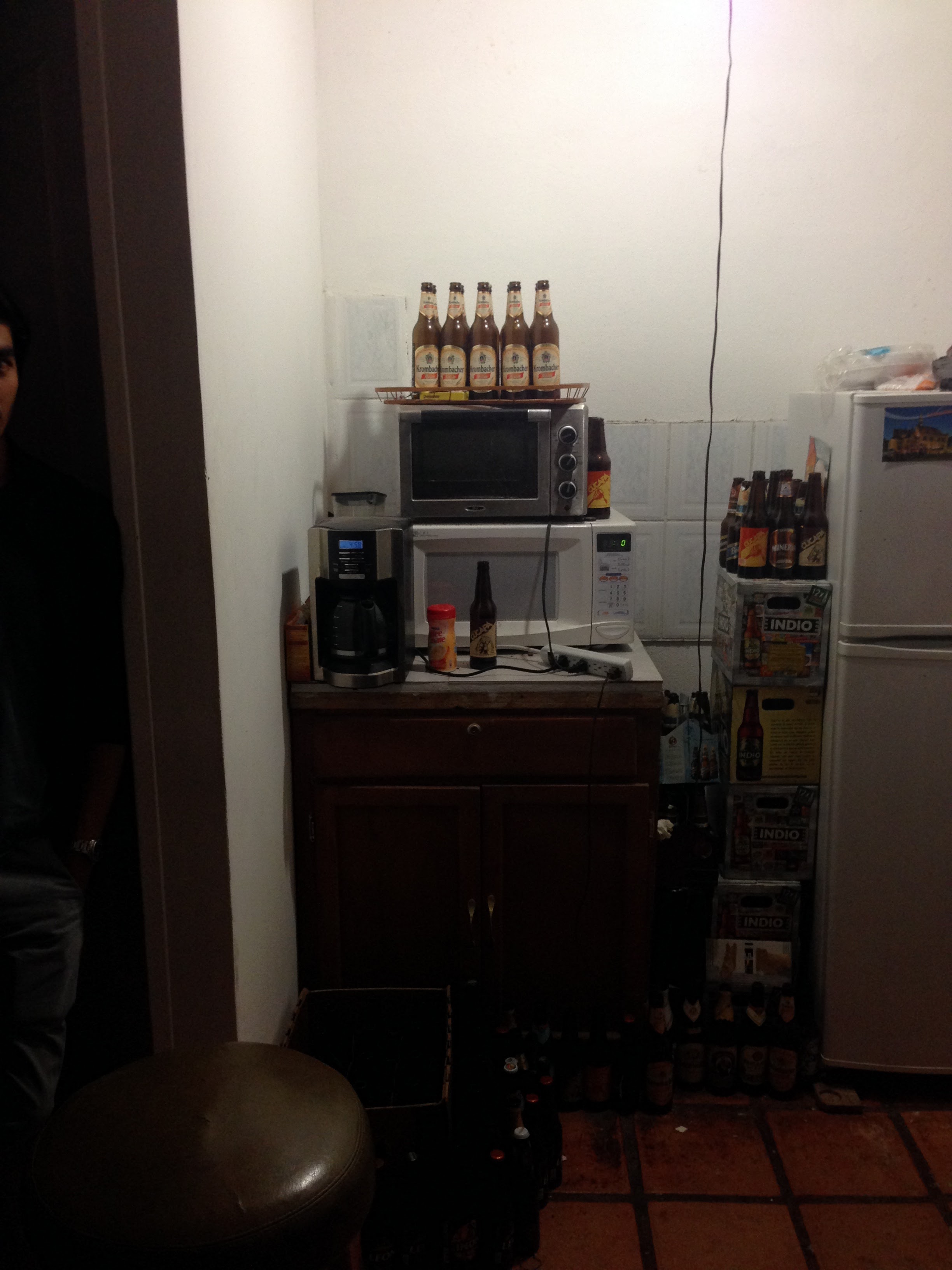 Lugar emblemático para algunos de mis amigos físicos que cursamos una materia extraña de relatividad en quinto semestre tutoriada por un estudiante que regresaba de su intercambio en Alemania, por eso las Krombacher arriba del microondas. La idea era planear la reunión con los colegas antes de avisarle al anfitrión, el cual siempre accedía de buena gana ya que, según él, no había mucho qué hacer de todos modos. Solo había que llegar con los refrescos y las botanas para el festín. Se cuenta que años después de que dejamos de reunirnos el cementerio de envases siguía ahí, aunque con más volumen de botellas.