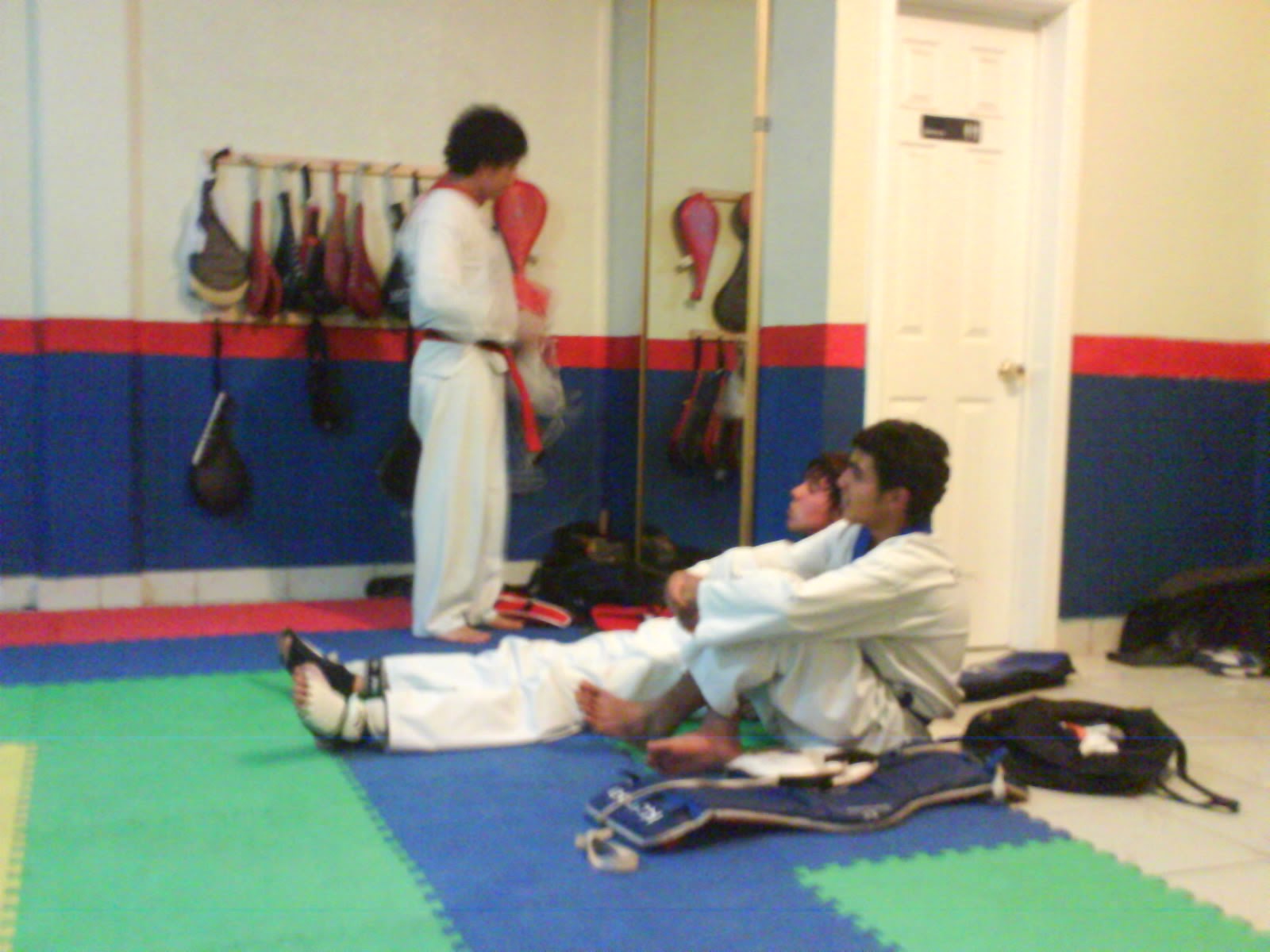 En la foto aparecen dos de mis compañeros con los que iba en la secundaria y que me invitaron al dojang. El que está de pie llegó hasta cinta negra y continuó un poco más. Parece que recién terminabamos de tener una sesión de combate porque aún traía protección en los pies.
