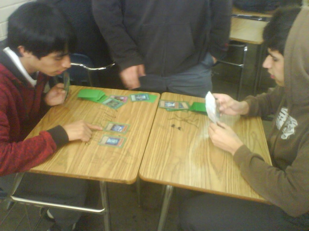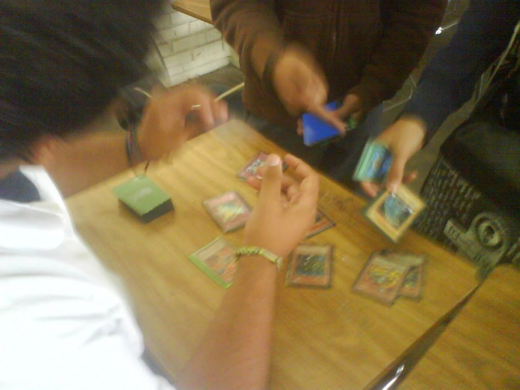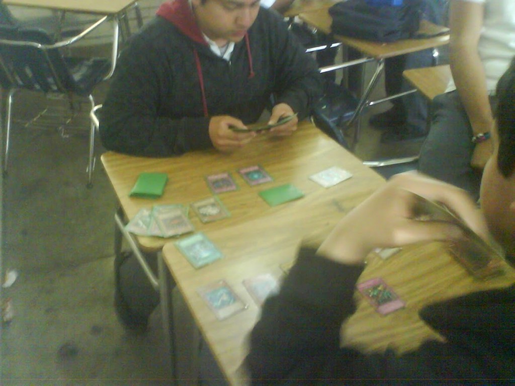 Durante los inicios de la prepa algunos amigos y yo caímos en el vicio del Yu-Gi-Oh!. Todo comenzó cuando iba en la primaria por allá del año 2003 que fue cuando la serie basada en este juego se hizo popular. Claro que en ese tiempo no contaba con celular o una cámara por lo que no pude documentarlo hasta que entré a la prepa. En esa época el juego agarró bastante fuerza y, no recuerdo por qué, comenzamos a jugarlo entre clases u horas libres que tuvieramos como se puede ver en las fotos. Lo interesante es que no solo jugábamos con los de nuestro salón, también íbamos a otros salones a jugar. Lo único que no hacíamos era jugarlo al aire libre porque no queríamos ser tachados de nerds u otakus, que por lo general lo éramos. La moda no duró mucho, o por lo menos no para mí. Algunos le siguieron por unos cuantos años más pero yo lo dejé al siguiente semestre aunque ocasionalmente me juntaba para jugar con los colegas. La cartas aún las conservo y las considero como un bonito recuerdo de lo que hacía en esos años.