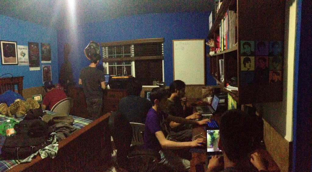 Durante la carrera nos dio por jugar League of Legends por unos cuantos semestres. Sinceramente no recuerdo por dónde nos llegó la idea de jugarlo pero sí que nos engranamos. Junto a mis compañeros de carrera me desvelaba jugando incluso una noche antes de algún examen parcial, todo esto con el objetivo de ganar una partida antes de irnos a dormir (lo cual tomaba tiempo a veces). En esta foto se puede ver parte de mi cuarto, que de hecho sigue idéntico, y algunos de los físicos que jugaban conmigo. No pudimos jugar mucho esa noche porque eran tantos los que se conectaban a la misma red de internet que comenzaba a fallar. Años después algunos lo siguen jugando ocasionalmente, yo lo dejé por la paz para dedicarme a otros juegos menos estresantes.