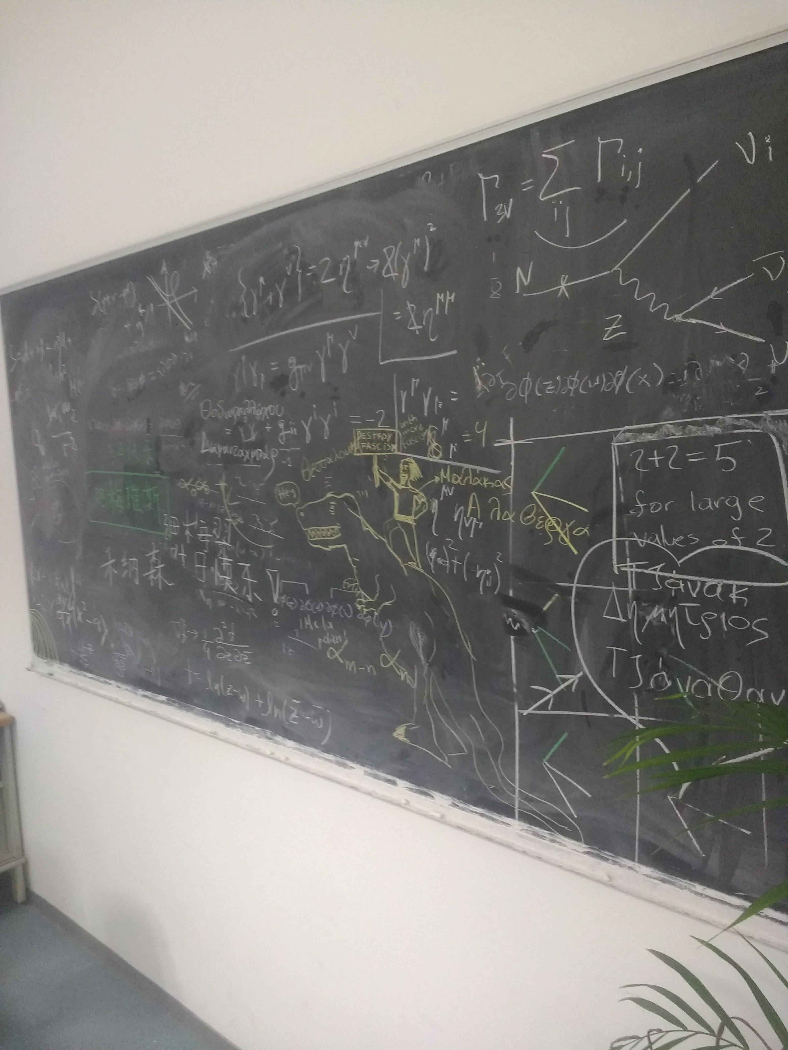 Este es el resultado de poner en una oficina a estudiantes internacionales de maestría y darles unas cervezas para tomar a la hora de la salida. Si ponen atención podrán encontrar cosas interesantes escritas en este pizarrón, sobre todo si saben algo de griego o chino. Claro que no hablo de conceptos de física ya que estos no requieren ningún lenguaje para leerse y lo que se alcanza a ver en esta imagen es el pan de cada día para alguien que estudia y/o trabaja con el Modelo Estándar. Si tienen tiempo para gastar pueden tratar de encontrar mi nombre escrito “por ay”.