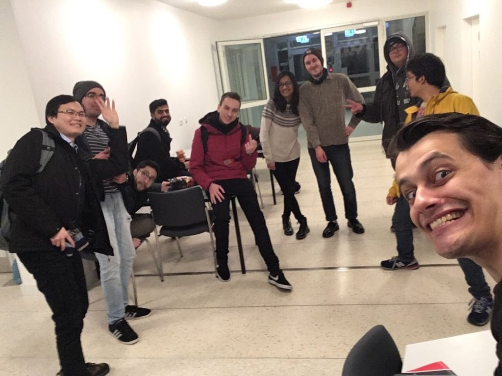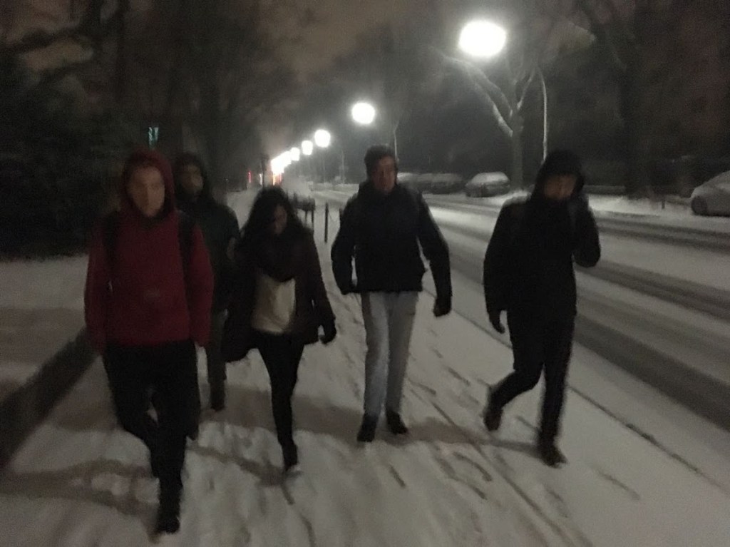 Colegas de la maestría en Bonn y yo decidimos ir por unas cervezas a un bar conocido por ser el punto de encuentro de la raza que estudia física y astrofísica en la ciudad. Antes de entrar al lugar todo se miraba normal en la calle; no había lluvia o nieve de la cual debiéramos preocuparnos. Después de un par de horas, chelas y muchas carcajadas, salimos del pub para encontrarnos con la bella imagen de que había bastante nieve sobre la calle, suceso que es muy raro en la ciudad. De hecho, es de las zonas con menos nevadas en Alemania (que es mejor así, créanme). Para aprovechar este bello espectáculo comenzamos a caminar en dirección a la estación central, ruta que usualmente toma una media hora a velocidad normal, o un poco más para mí que camino lento. Claro que bajo estas condiciones y deteniéndonos a jugar con la nieve cada que se podía nos tomó más tiempo de lo acostumbrado. En el camino, a un amigo mexicano se le cayeron los lentes sobre la nieve y curiosamente un lente también. Ya se imaginarán el show que fue tratar de encontrarlo. Creo que al final sí logró recuperarlo para más tarde volver a perderlo. Poco antes de llegar al Bahnhof, tuvimos que hacer una parada en el instituto donde trabajo para atender el llamado de la naturaleza. Son las ventajas de tener las llaves del edificio y poder entrar a cualquier hora. Este momento lo capturó un amigo de Grecia, que es la segunda foto de este post. Al final nos fuimos al centro a terminar la noche con unas pizzas que también son un lugar de interés para los científicos del área. La mitad de los que salen en esta foto ya se fueron a otras ciudades mientras que la otra mitad sigue aquí tratando de sobrevivir el doctorado.
