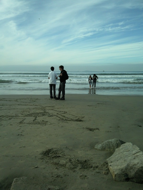 Era el último día de clases del primer semestre de la prepa y se nos ocurrió algo más interesante para divertirnos que ir por la tradicional soda infinita al McDonald’s. En su lugar nos fuimos a caminar por la playa un rato a la hora de la salida, aprovechando que ese día las clases acabaron temprano. No éramos todos los que nos juntábamos para cotorrear pero sí un pequeño subgrupo del gran conjunto de amigos que se reunía en la explanada. Después de hacer figuras en la arena y meter los pies al agua (cosa que yo no hice) se presentó este momento en el que cierta persona tomó esta foto con su celular. En la imagen salimos tres amigos y yo. Los que salen al fondo apenas los había conocido en la prepa y el que está viendo en dirección al mar es un viejo amigo de la primaria; ya teníamos bastante tiempo de conocernos. Todos estos años pensaba que en ese instante estaba platicando con este tipo pero en realidad justo le acababa de tomar una foto a la figura sobre la arena. Comparando los tiempos en las que se tomaron ambas imágenes, 11:04 a.m., pude concluir esto. A parte, estoy parado detrás de él con el celular en mano, cosa que no se ve a primera vista ya que da la ilusión de que le estoy contando algo mientras contempla el océano. Y eso fue todo. Seguimos un rato más cotorreando y luego cada quien se fue a su casa como cualquier otro día. Lo que la persona que tomó esta imagen no sabía es que con ella iba a desatar una cadena de eventos importantes en mi vida que comenzaron apenas unos días después de este trip a la playa.