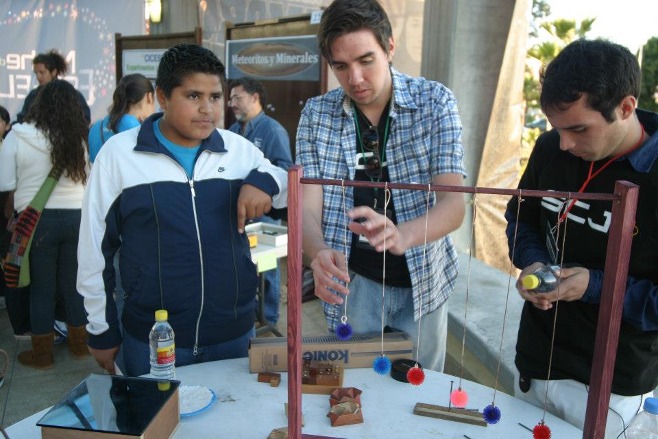 La noche de las estrellas ha sido un evento a nivel nacional en el que la Sociedad Científica Juvenil ha participado desde sus inicios mediante la presentación de proyectos, experimentos o dando pláticas de divulgación de la ciencia. De hecho, poco antes de que la SCJ fuera fundada de nuevo se nos invitó a participar en esta fiesta astronómica para su versión de febrero 2011. Así que apenas un par de días después de nuestro inicio nos encontrábamos en el gimnasio de la Universidad con una bobina Tesla (que apenas alcanzamos a terminar) dando información sobre nuestro pequeño grupo de diez personas que se juntaba a platicar sobre ciencia y tecnología. Pero este primer evento que les platico es una historia para otra ocasión. Ahora me concentraré en nuestra segunda participación, que fue la edición noviembre 2012. Casi dos años pasaron entre el primer y segundo evento, por lo que naturalmente se contaba con más miembros ahora. En esos meses justo se acababa de unir un grupo grande de jóvenes que venían de Mexicali para estudiar física en nuestra hermosa ciudad. Otro tipo que se unió también durante la invasión de los cachanillas es el que se encuentra a mi izquierda en esta foto; el que orgullosamente porta su playera de la SCJ. Desde que comenzó a participar con nosotros mostró gran interés por nuestra organización y enorme pasión por las actividades que realizábamos. Fue por estas razones que, un año después de que se tomara esta foto, decidí hacer uso de mi poder e influencias como presidente para dar el dedazo y designarlo como futuro presidente. Otra cosa que influyó para que dejara la presidencia fue que me iba de la ciudad para mi intercambio en León y también ya era tiempo de dejar la tiranía de tres años. Después de comentarle mi idea durante un evento que atendíamos fuera de la ciudad (y con gran presión grupal por parte de nuestros compañeros) accedió muy alegre a convertirse en el segundo presidente de esta ya no tan nueva hermandad. Fue aquí que se estableció que los periodos de gobierno iban a ser de solo un año (para no repetir mi porfiriato) y la tradición de celebrar la posada navideña junto con el cambio de poder también se introdujo en esta ocasión. Y bueno, aquí estábamos los dos haciendo nuestro trabajo de divulgadores mientras el chamaco a mi derecha nos ignoraba.