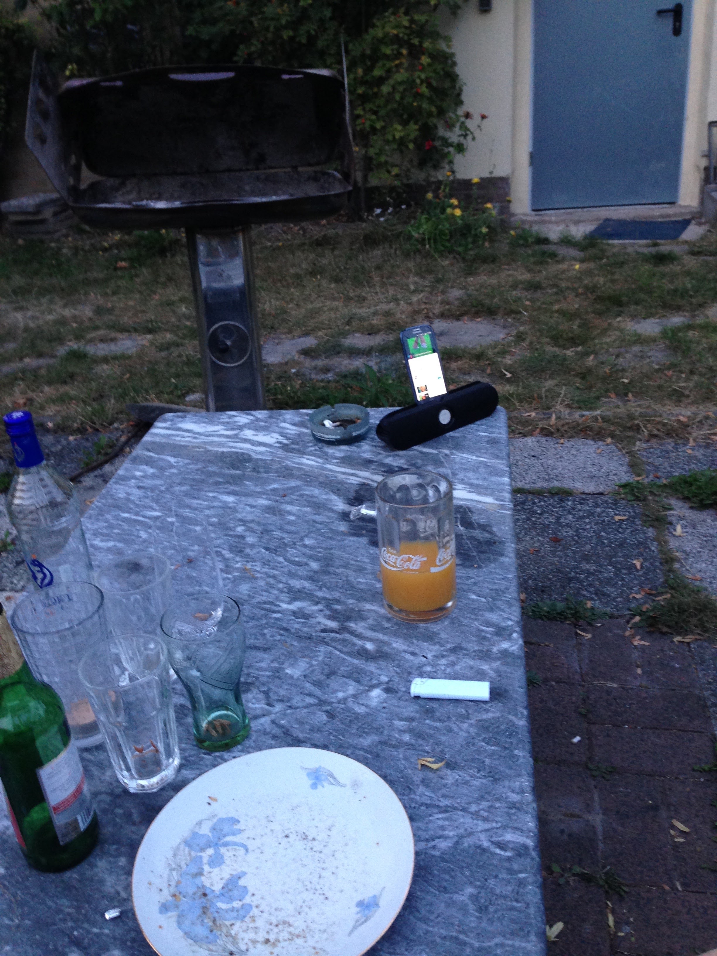 Es una cálida tarde de verano en Marburg y mi roomie, que se la pasaba fumando en el patio, está como siempre sentado en su silla echándose unas chelas muy a gusto por lo que decido unirme a su cotorreo un ratito aprovechando que ya había acabado mi tarea y no tenía nada de que preocuparme más que despertarme temprano al otro día para mi cursito de idiomas. En esta ocasión tenía en un loop una rolita que acababa de salir llamada Stoff und Schnaps por unos artistas neerlandeses, por lo que estaba suene y suene por bastante tiempo. De hecho estuvo días con esta canción a todo volumen en el jardín; fue todo un hit de verano en Alemania. Al final me terminó agradando la canción y le digo que me pase el nombre para buscarla. De ahí fue que siempre que conocía a algún alemán o alemana le mostraba esta canción y se sorprendían porque era extraño para ellos que un extranjero, recién llegado, les anduviera sacando rolas en su idioma. Más tarde cuando llegué a Bonn hice lo mismo con mis roomies y tuvieron la misma reacción que los demás. Siempre que había cotorreo y tenía oportunidad de poner una rolita seleccionaba esta, ya sabían que era yo el que la había puesto. Ahora se acuerdan de mí cada que escuchan esta canción o simplemente la ponen para echarme carrilla. Les da más risa todavía que me sé la letra y otros que no me conocen tanto se sorprenden por esto. En esta foto se puede ver una parte del video en su celular, que está al final de la mesita. También aquí se puede apreciar un poco del patio de la casita donde viví dos meses, quizá luego les comparta más fotos de este bello lugar. Afortunadamente el resto de los roommates no estaban en esas fechas por lo que éramos tres tipos viviendo y compartiendo un baño. No me quiero imaginar el caos en la cocina o baño cuando todos estuvieran ahí. Pero bueno, esta es la vida de estudiante por la que a veces tenemos que pasar y que con los años se le va agarrando cariño a estas memorias.