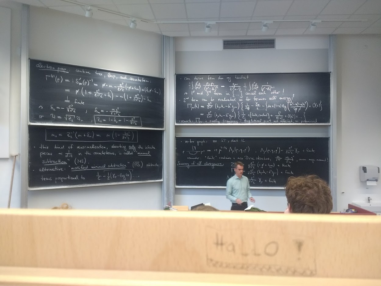 Aquí es donde tomé algunos de mis cursos de maestría en Bonn. La materia más interesante, e importante, fue la de Cuántica de Campos que necesité para mi tesis y sigo usando todavía para mi investigación en el doctorado. En esta imagen se pueden ver los pizarrones llenos con temas avanzados de las últimas clases que llevé con este profesor que, según yo, es el mejor impartiendo este curso. Para los que estudian o estudiaron en mi antigua Universidad notarán que aquí en Alemania es común utilizar tiza en lugar de plumones. A mi parecer esto es mejor porque se escribe con más fluidez y es muy fácil limpiarlos para seguir escribiendo, no como en el otro caso donde se tiene que cambiar el equipo cada cierto tiempo porque no saben usarlos. Otra diferencia es que los “salones” son tipo auditorio; los alumnos están sentados en gradas, casi como cuando vas al cine. Todo esto me parecía muy interesante antes de venir para acá porque no es algo a lo que haya estado acostumbrado durante mis estudios del bachelor. De hecho, cuando comencé a impartir tutoriales me sentía algo incómodo al momento de escribir con tiza porque nunca había practicado para eso. Volviendo a México, me parece que estos sistemas se manejan en otras Universidades donde hay más presupuesto. Un caso especial fue el de León, durante mi intercambio, donde utilizaban gis pero en salones normales con mesabancos. De cualquier manera, hay cosas que no cambian si vas de una Universidad a otra o un país a otro. Por ejemplo, aquí también les da por rayar en sus lugares de trabajo.