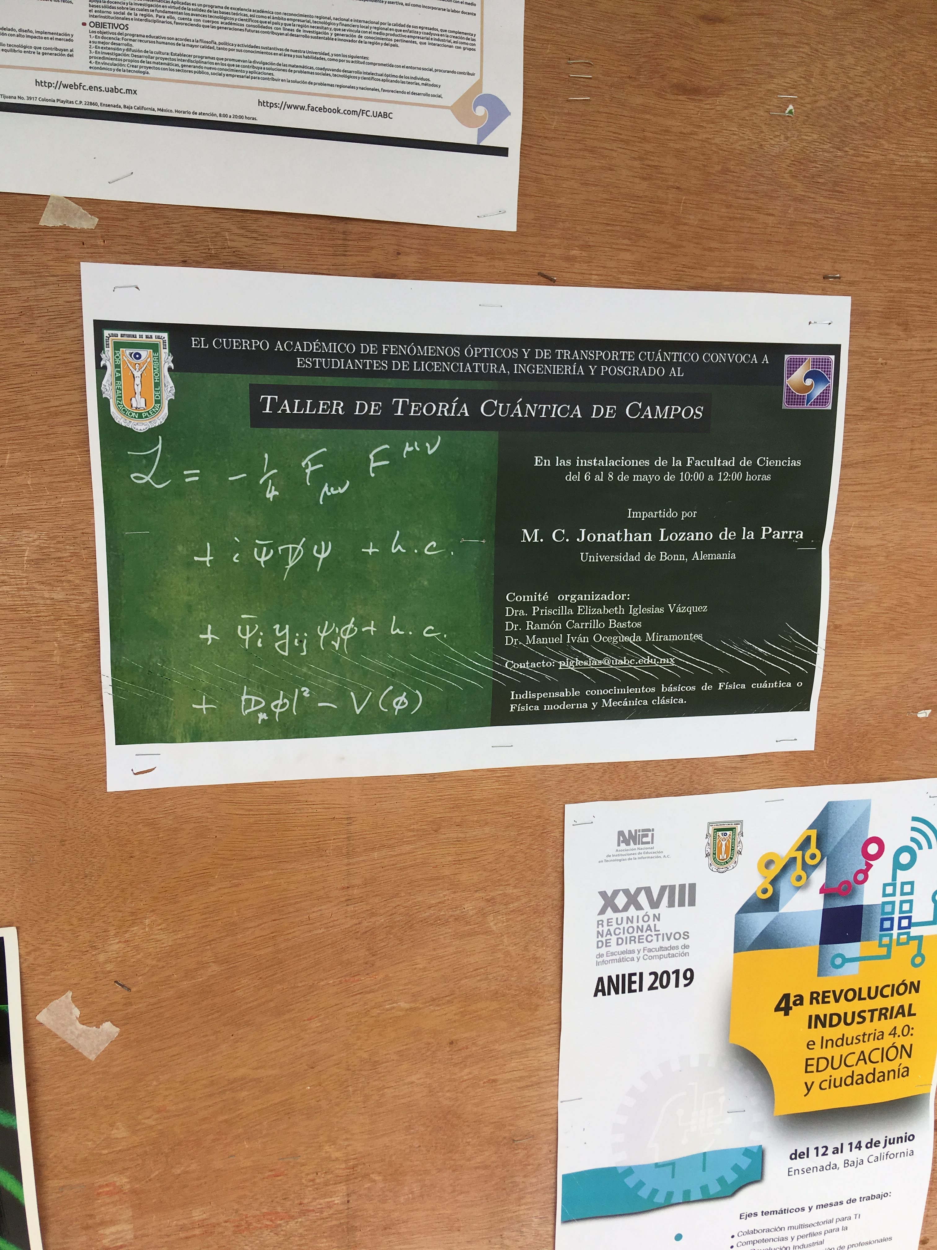 Hace ya casi tres años me tocó impartir un poco de lo que aprendí durante mi primer año de la maestría en Alemania. No recuerdo muy bien cómo fue que se me ocurrió hacer esto en mi facultad pero se lo comenté a una de mis profesoras con la que tomé clase en la carrera. A ella le pareció tan buena la idea de este taller que hasta programó un seminario del mismo tema, a parte de este evento, para que la mayoría de los estudiantes pudiese asistir. Fue una buena experiencia porque pude hacer lo que me gusta, que es dar clases, y aún me tocó ver caras conocidas entre los alumnos a parte de la de los profes, que de hecho también tomaron notas de lo que escribía en el pizarrón. Como ya les había comentado en posts pasados, estos temas no se ven en mi carrera y me parece que tampoco los imparten en las clases de maestría que imparten los institutos de investigación de la ciudad, por lo que también llegaron a asistir unos cuantos estudiantes de posgrado en busca de temas frescos que no fueran óptica, astronomía o nano. Espero que con esto alguno de los que asistieron se hayan animado a seguir por el camino de la Cuántica de Campos y que ya le entiendan un poco mejor a lo que se vio aquí que solo fue una breve introducción a esta gigantesca rama de la física. También es posible que haya desanimado a muchos pero por lo menos les ahorré algo de tiempo para que buscaran su pasión por otro lado. Ahora con esta visita a México por fin podré impartir un taller desde que comenzó la pandemia, solo que ahora será de Relatividad. A ver cómo nos va.