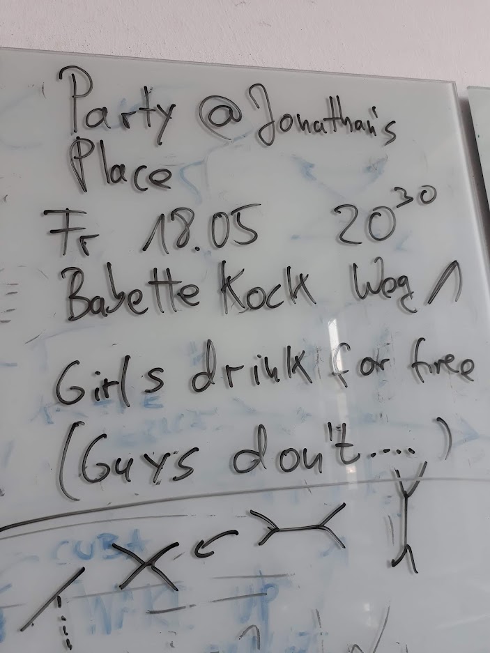 Hace unos días me pasaron esta imagen que tomaron en la cocina del instituto de física de la Universidad de Bonn hace ya casi cuatro años. De hecho, este pizarrón lo pueden ver en un post que publiqué hace tiempo llamado Feierabend. La verdad es que no sé quién se aventó este lindo anuncio de la fiesta que andaba organizando pero debió ser alguno de los que ya tenían su oficina en ese edificio. En este cotorreo fue donde se tomó la foto en la que salen la mayoría de los Buben. Como siempre, es complicado reunir a todos los amigos; alguien va a faltar a este tipo de eventos con la razita por lo que una foto con toda la banda reunida es virtualmente imposible. En esos tiempos vivía en una residencia estudiantil por lo que las fiestas se daban casi cada fin de semana y mi depa, que compartía con otros tres alemanes, era conocido por ser muy fiestero. Esta tradición ya la tenían desde antes que yo llegara a vivir con ellos por lo que tuve que adaptarme a su estilo de vida, que no me tomó mucho esfuerzo para ser honesto. Pronto escribiré un poco más sobre este infame lugar conocido como Babette-Koch-Weg (BKW) y las fiestas que organicé por allá. Por lo pronto les dejo esta linda memoria que no sabía que existía pero que me sorprendió mucho al verla pues parece ser que mucha gente se enteró del evento que se armó en la casa; con razón llegó tanta gente esa noche.