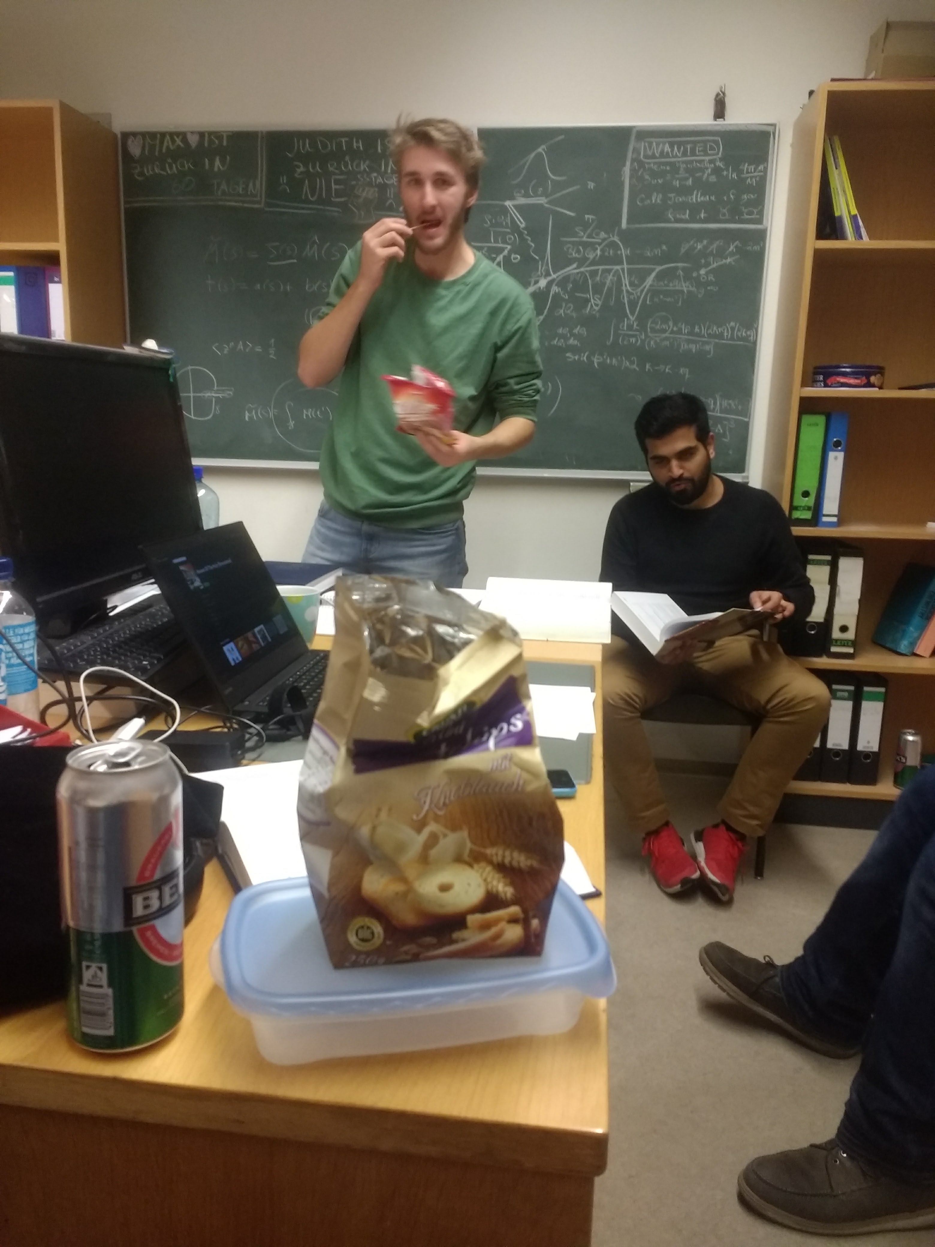 Hace ya casi cinco año de que estoy prácticamente diario en esta oficina. Las primeras veces que la visité fue para ir a preguntarle cosas a mi tutor de Teoría Cuántica de Campos que, unos meses después, se convertiría en mi compañero de oficina. Ahora un poco de historia. Después de terminar el segundo semestre llegó el momento de buscar con quién hacer la tesis. Para ese entonces ya sabía que no haría cosas de gravedad porque esos grupos de investigación estaban siempre llenos; la mayoría de mis amigos quería trabajar en esos temas. Fue que me decidí buscar alguna alternativa que tuviera que ver con partículas por lo que me acerqué a un profesor que investiga esto para pedirle un intership (hice esto porque me faltaban algunos créditos para iniciar la tesis). Este trabajo me tomó un par de meses y al terminar le seguí con la tesis. Durante unas semanas estuve sin un lugar fijo para trabajar; no había espacios en el instituto. Resulta que en esta oficina había un espacio libre pero el profesor “encargado” tenía una llave extra que la secretaria no contempló. Este chisme me lo platicó el de suéter verde que sale comiendo y yo de vuelta a la secretaria. Unos días después este profesor se me acerca y me entrega la llave de la puerta para que ya por fin me pueda quedar ahí. Creo que no estaba muy contento. De hecho me parece que nunca le he caído bien. En fin, ya que todos los que nos quedamos en Bonn para la tesis estábamos establecidos en nuestros respectivos institutos, comenzamos a reunirnos los viernes a la hora de la salida como pueden ver en esta imagen. A veces nos juntábamos aquí o nos íbamos al Instituto de Física que está a un lado del nuestro, como pueden ver en el post de Feierabend. Ahora la configuración de las mesas ha cambiado, al igual que el de las personas que integran este pequeño espacio. No falta mucho para que la rotación de estudiantes cambie de nuevo, de hecho en unos meses ya nos vamos los dos más antiguos. Y sí, se puede pistear en la Universidad.