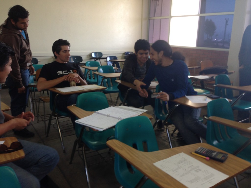 Así es como se miraba una típica clase en la facultad de ciencias mientras estudiaba ahí. Quizá puedan ver una que otra cara conocida de otros posts, como el de Rodrigo. Una cosa que resalta es el salón que está prácticamente vacío, no somos muchos y, de hecho, es de esperarse. En mi generación entramos unos treinta alumnos, de los cuales terminamos como seis o siete. Me parece que fuimos unas de las generaciones más grandes que entró, quizá porque The Big Bang Theory, la serie de televisión, estaba de moda en aquellos tiempos. Yo no me vi influenciado por el programa de tele, pero me di cuenta de que muchos de los que entraron sí (esos que hablan más de lo que saben). Regresando a la imagen, este momento es de cuando apenas íbamos a la mitad de la carrera, y como ven ya no quedaban muchos, pero por fortuna todos los que salen aquí se graduaron. Otra cosa que resalta es la camisa de la SCJ que trae el maestro. Sí, él era el profe que nos impartió como tres cursos y aún no tenía treinta años. Debido a que varios miembros de la SCJ entraron a la facultad, esta se influenció un poco por nosotros. Tanto así que este maistro decidió comprarnos una camisa cuando las sacamos a la venta. En fin, lo que quería resaltar en realidad es la convivencia que existe entre los alumnos y los docentes, algo que no existe acá. En Alemania los profesores llegan, dan su clase y desaparecen. Claro que puedes hacerles preguntas o comentarios durante la clase, pero con los que en realidad tienes que lidiar son los tutores. Ellos son los que se encargan de los ejercicios y de aplicar el examen. Es por esto que ver esta imagen me llama la atención. Son situaciones que traté de aplicar por acá, pero igual el alumnado se resistía a convivir; no cotorrean como en México. Lo que me motiva ahora es que pronto estaré de vuelta en la facultad y, así como este profesor, ahora sí se armará el cotorreo que tanto me hace falta.