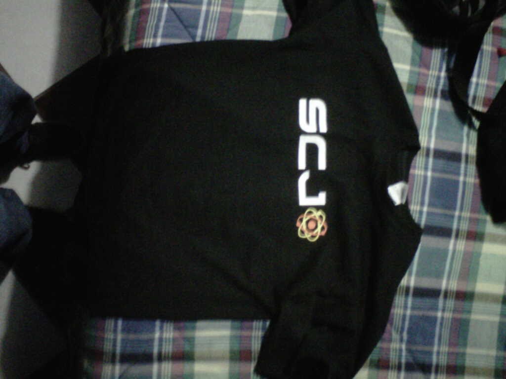 Cuando volvimos a formar la SCJ, se nos regalaron diez camisetas; una para cada miembro. Eran grises y con el logo original de la asociación. Sencillas, pero nos sentíamos orgullosos de portarlas. Como ya sabrán, con el tiempo nuevos miembros se fueron uniendo a nosotros, solo que no teníamos los medios (financieros) para proporcionarles una. Más o menos un año después, uno de los refundadores se encontraba trabajando estampando playeras en el taller de serigrafía de su tío. Fue entonces que se nos ocurrió que, si conseguíamos las camisetas por fuera, él podría ponerles el logo gratis. Aprovechando que íbamos a hacer esto, decidimos también darle una nueva imagen a nuestro uniforme. El resultado fue el de la foto. Simplemente tomamos las iniciales y le pusimos un logo a un lado. Lo interesante fue que, ese logo lo había hecho una diseñadora mientras jugaba con nuestro nombre. No sé exactamente de quién era amiga, pero se aventó unos diseños medio extraños y solamente agarramos el átomo que sale en la imagen. Pues esta amiga se enojó con nosotros, según porque le robamos su trabajo. Estrictamente hablando sí fue así, pero ella también hizo uso del nombre de la agrupación sin nuestro permiso. Al final, y para no quedar tan mal, le regalamos un ejemplar de nuestras playeras. Después de esto ya no supimos de ella. Hoy en día tenemos diferentes playeras; al parecer cada sede cuenta con su propio diseño. Quizá se me ocurra aventarme otro estilo ahora que regrese. A ver qué dice el presidente de nuestra sede a mi propuesta.