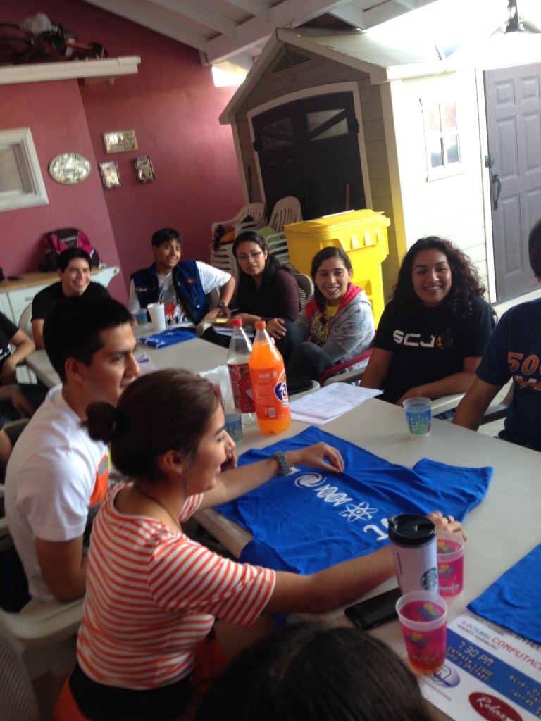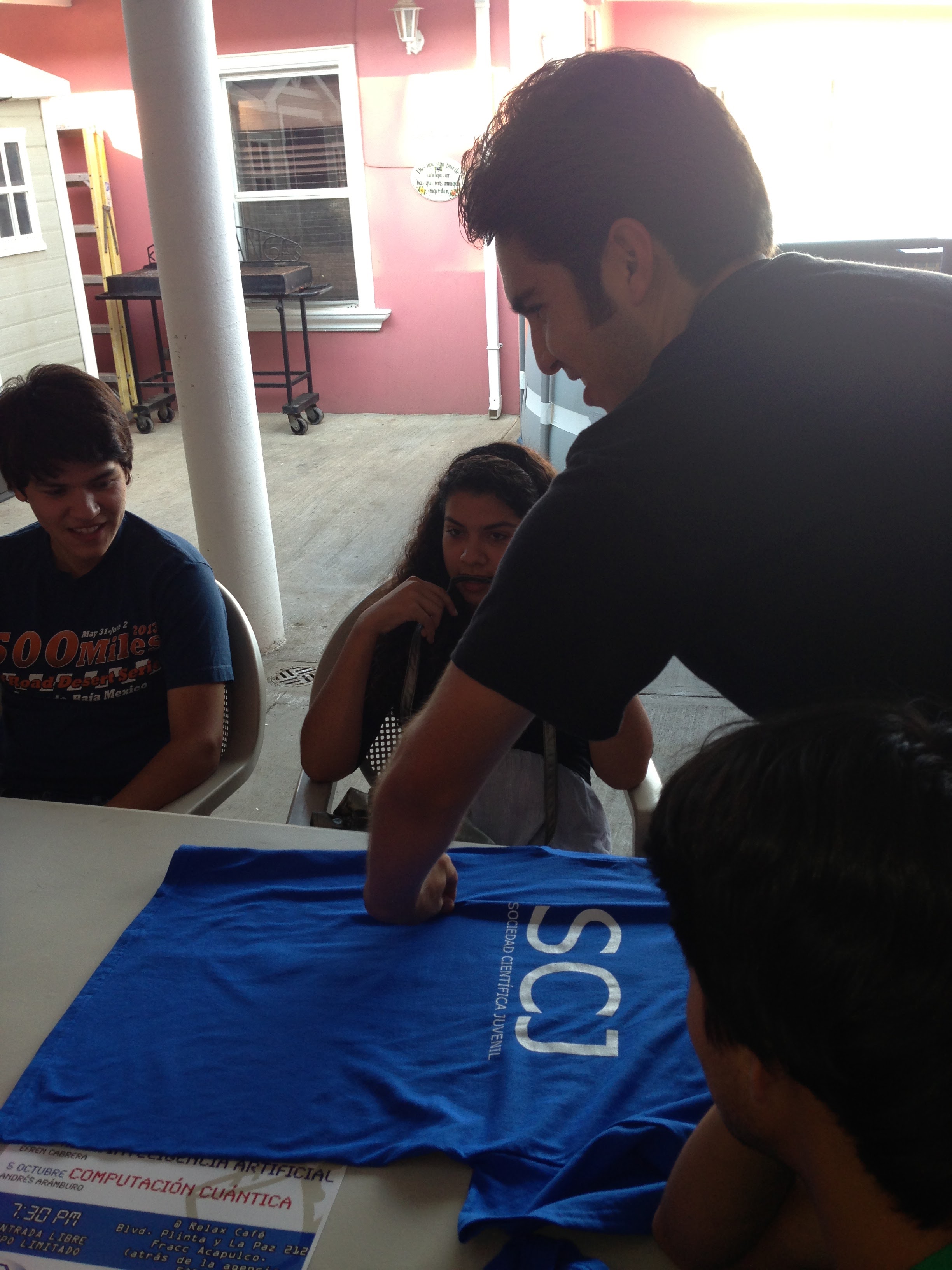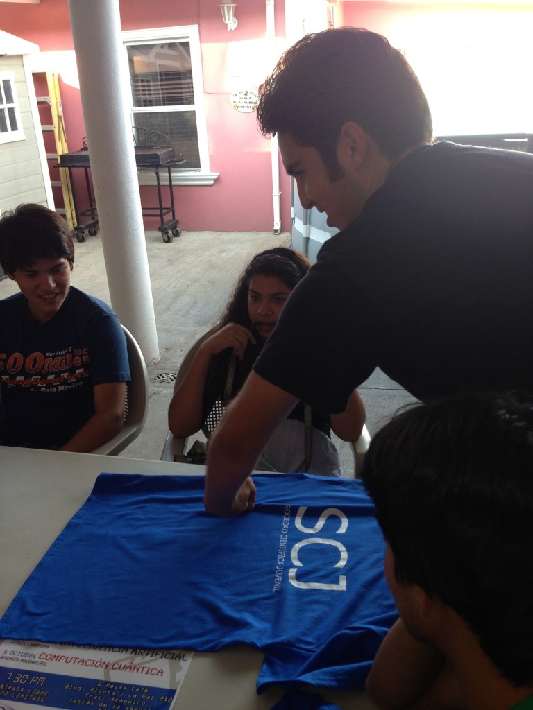 Hace unos nueve años se nos ocurrió rediseñar el uniforme de la Sociedad Científica Juvenil. Al igual que la primera vez, me tocó darle forma a la nueva playera y este fue el resultado. El azul siempre fue el color de nuestra asociación, por lo que tenía que ser de esta longitud de onda. Las figuras en la parte de atrás representan las disciplinas en las que nos enfocábamos; matemáticas, física, biología, astronomía y computación. En la parte de enfrente colocamos “SCJ” y debajo lo que significa, para que no nos confundan con la Suprema Corte de Justicia. De hecho, este fue el día que las llevamos a mi casa durante una de nuestras sesiones para entregarla a los miembros. Para contrastar esto, una compañera se puso su camisa negra, de la que ya les hablé un poco, y pueden comparar cómo cambió nuestra imagen. Otro detalle que no tiene que ver con lo que les comento, es que hay un flyer sobre la mesa (que también me tocó diseñar, quedó lindo). Esto lo hicimos para darle propaganda a una serie de pláticas que organizamos en un café de la ciudad. La idea era que una vez al mes un compañero diera una charla al público en general. Luego les comento qué fue lo que pasó con este proyecto, porque fue una historia muy interesante. In short, todos los negocios a los que fuimos quebraron.