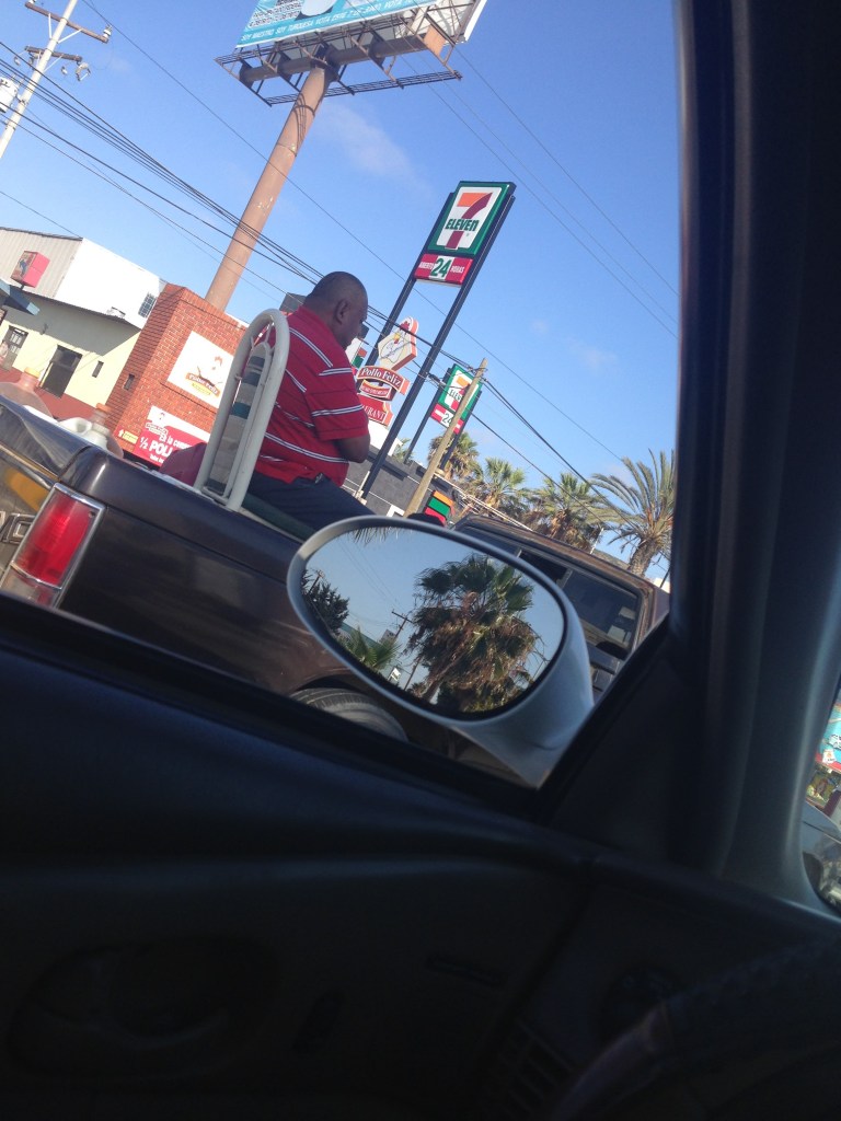 Me parece que esta imagen se explica sola. O no: ¿Qué está pasando? Un día manejando (mientras esperaba a que el semáforo cambiara) me encontré con esta escena sobre una de las calles principales de mi ciudad. Nunca me había tocado ver algo similar. Sí había visto gente sentada sobre la cajuela de este tipo de carros, pero nunca así: sobre una silla para mesa de cocina. La verdad, yo también he viajado en la parte trasera de esta forma, pero sentado sobre el piso. Aun así, me ponía algo nervioso no ir con el cinto de seguridad puesto. Ahora imagínense esto. Volviendo a la foto, este hombre emanaba un aura de seguridad que jamás había presenciado. Me atrevería a decir que no le tiene miedo a la muerte; de hecho la reta al exponerse de esta manera. En fin, solo espero que ese día haya llegado sano y salvo a su destino. Was für ein kranker Typ.