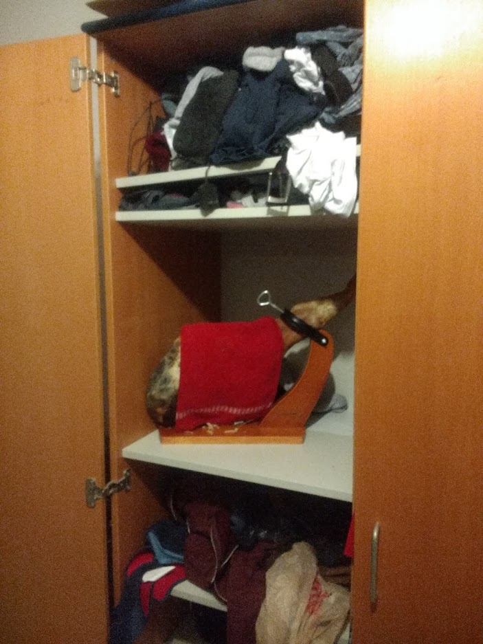 En la navidad del 2017 a mi roommate le regalaron un jamón serrano. Era un regalo algo inusual por parte de sus padres, pero bienvenido en nuestro apartamento. Esta pierna se encontraba siempre en la cocina, por lo que durante un tiempo había algo que botanear en la madrugada después de la pedalera. Durante el pico de las fiestas que organizaba para mis amiguitos en Bonn, tocó que este jamón estuviese presente para el deleite de nuestros invitados. Fue una de las mejores fiestas; mucha gente, buena música y excelente ambiente. Lo mejor de todo es que había un cuarto desocupado y contábamos con más espacio del que ofrecía nuestra pequeña sala, cocina y balcón (lleno de botellas vacías de anteriores cotorreos). La verdad es que esta recámara la usamos para los torneos de beer pong y para poner una máquina de láseres. En fin, la noche pasó muy rápido como en toda buena fiesta, y era hora de irse a dormir. Antes de que todos se fueran, algunos me comentaron que dejaron un regalito en mi cuarto. Nunca me imaginé que hubieran puesto este jamón en mi armario. De hecho pueden ver que sacaron mi ropa, incluso una repisa, y acomodaron la pierna con todo y trapo. Fue entonces que entendí por qué durante la fiesta estos cuates se la pasaban en mi cuarto. Lo curioso es que no me molestó en lo absoluto. Al contrario, me dio mucha risa y fue tema de conversación por un rato.