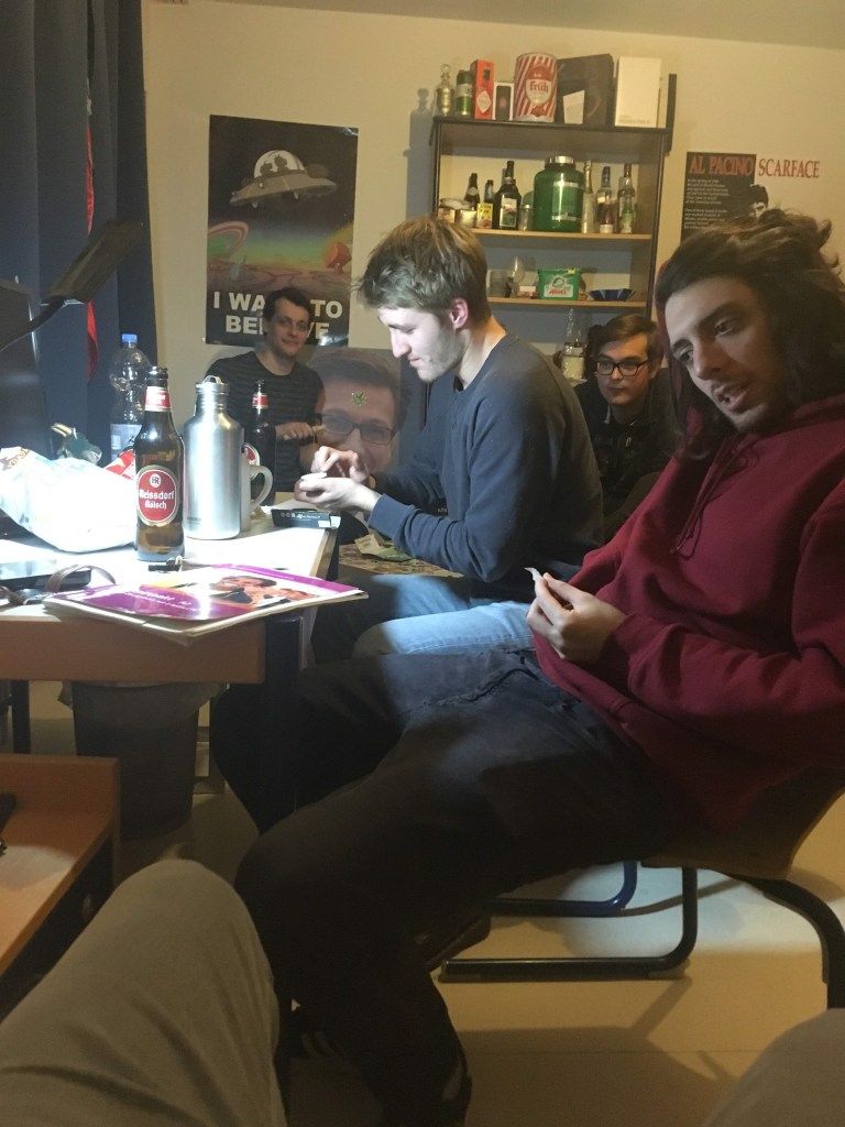 Una clásica tarde con los amigos de la maestría en Bonn. Este era el típico setup cuando nos reuníamos en el BKW; compas, cerveza y cotorreo por unas cuantas horas. El cuarto que me tocó en este edificio era relativamente grande. Podía acomodar a unos cuantos colegas, como en la foto, y sobraba algo de espacio para que la gente circulara. Esta recámara era ideal para estas ocasiones porque la sala del departamento estaba casi siempre ocupada por mis otros roomates y sus amigos. Es por esto que siempre había oportunidad para juntarnos en mi cuarto para chillear un rato; siempre tenía sillas extras y una mesita para jugar cartas con los panas. Algo lindo también que sucedía durante el invierno es que podía dejar afuera unas cervezas y se mantenían siempre frías, solo había que abrir la puerta-ventana y agarrarse una. Era aquí donde planeábamos las fiestas que se celebraban en este dormitorio, todas con éxito.