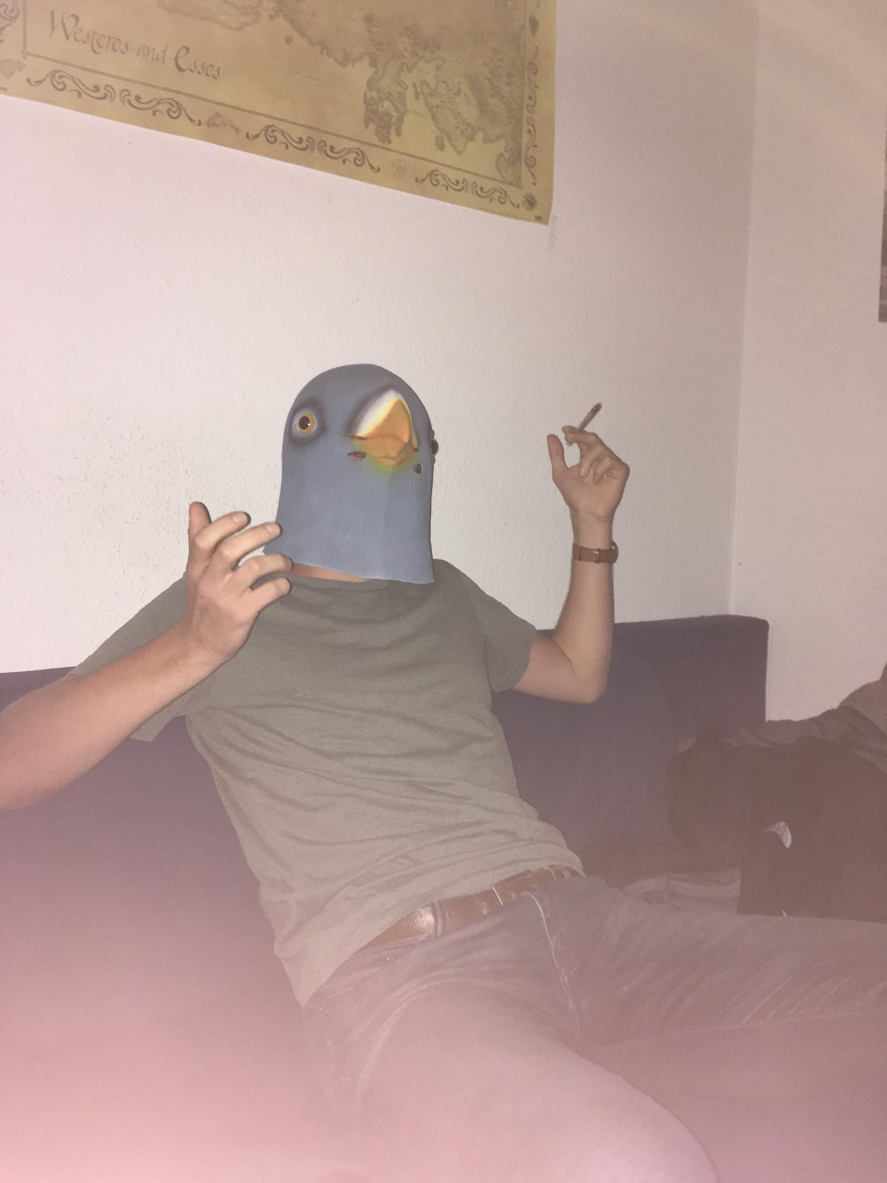 Hace unos años compré una máscara de pájaro y fue una de las mejores inversiones que he hecho. No sé exactamente la razón detrás de esta compra, imagino que fue una de esas tardes que andas buscando cosas por Amazon y te encuentras con algo tan ridículo que tienes que comprarlo. Lo interesante fue que esta máscara fue bien recibida por la comunidad fiestera del Master; cada que se armaba cotorreo esta ave encontraba una cabeza en la cual posarse. Esta compra también motivo a otras personas a conseguirse sus respectivas máscaras, lo que hizo las fiestas aún más entretenidas. Incluso, este artículo le tocó viajar a México, y conocer otros rostros durante una de mis visitas; igual fue un éxito. Tristemente, durante un par de años estuvo perdida, justo después de llevármela a un festival de música. En realidad las fiestas se acabaron, por la pandemia (ya vendrán los posts sobre el 2020 en unas semanas más). Fue cuando regresé a mi país que la encontré de nuevo; estaba en una silla de acampar. En fin, tenía ganas de compartirles esto porque ya apareció y seguirá apareciendo en muchas fotos que publicaré en el futuro, solo para que sepan qué onda con esta Maske.
