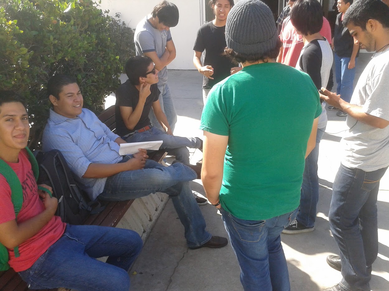 Esta imagen fue capturada durante un break entre clases. Era el tercer semestre de la carrera y aún éramos bastantes alumnos, como pueden ver en la foto. La ausencia de mujeres puede notarse; en nuestra generación no contamos con su estimada presencia. El hombre de camisa azul sentado sobre la banca era nuestro profe y nos impartió como tres cursos durante la carrera. Era buena onda y a veces cotorreaba con nosotros durante los tiempos libres. Ahora me veo un poco reflejado en él. Justo comencé a “oficialmente” dar clases y me la he pasado muy bien; ya tenía años con ganas de hacerlo. Recuerdo cómo percibía a este profe y entiendo cómo me ven ahora mis alumnos. Lo único a lo que no me acostumbro es a que me llamen profe o me hablen de usted, prefiero que me digan solamente Jonathan. A ver cómo va saliendo todo, que tengo muchas ideas en la cabeza sobre cómo meter nuevos temas a la facultad.
