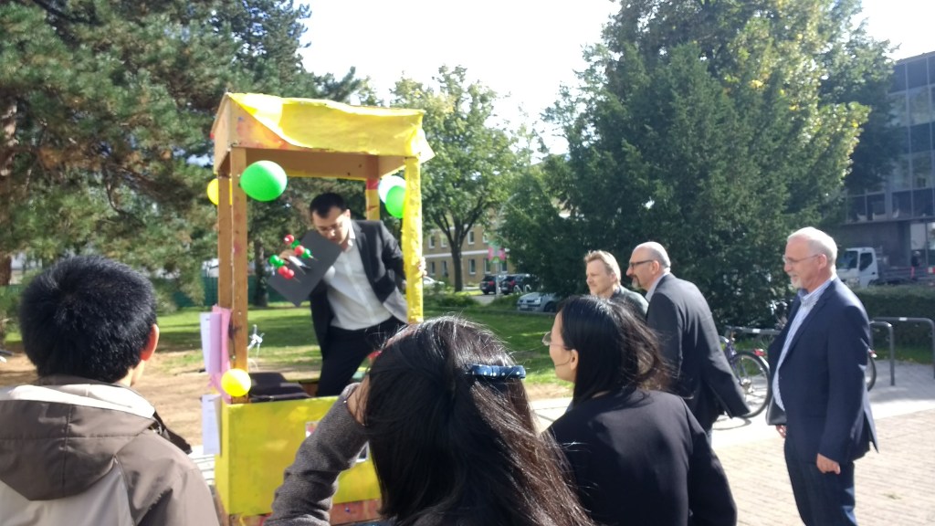 Esta es parte de la tradición alemana que sucede después de tu coloquio de doctorado y el examen oral. Tus colegas te decoran un carrito con fotos tuyas (usualmente de fiestas) y los papers que sacaste. Ya que te subiste, tus sinodales te pasean al rededor de la cuadra mientras la demás gente va detrás de ti desfilando y haciendo ruido. Si todo sale bien, seré yo el de la foto la siguiente semana. En esta foto sale un compañero recién graduado. También sale mi profesor, el que se parece a Walter White.