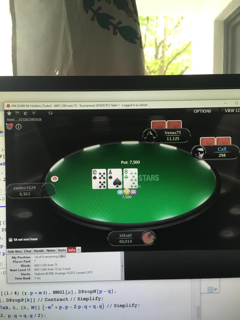 Esta es una foto de mi monitor mientras jugaba Póker en línea en medio de la pandemia. Esta era la mesa final, donde no sé cuántos jugadores participaron y el ganador fui yo. Lamentablemente no era dinero real, pero me sentí bien después de ganar el torneo a pesar de no tener estrategia en el juego. También pueden ver que al mismo tiempo me encontraba trabajando en uno de mis proyectos que serían parte de mi tesis de doctorado. Todo esto detrás de la ventana del juego. Atrás se puede ver el mismo árbol que sale en Balkon, pero ya con bastantes hojas. Se puede decir que estos eran mis días durante la mayor parte del 2020; trabajar y jugar, trabajar y jugar.