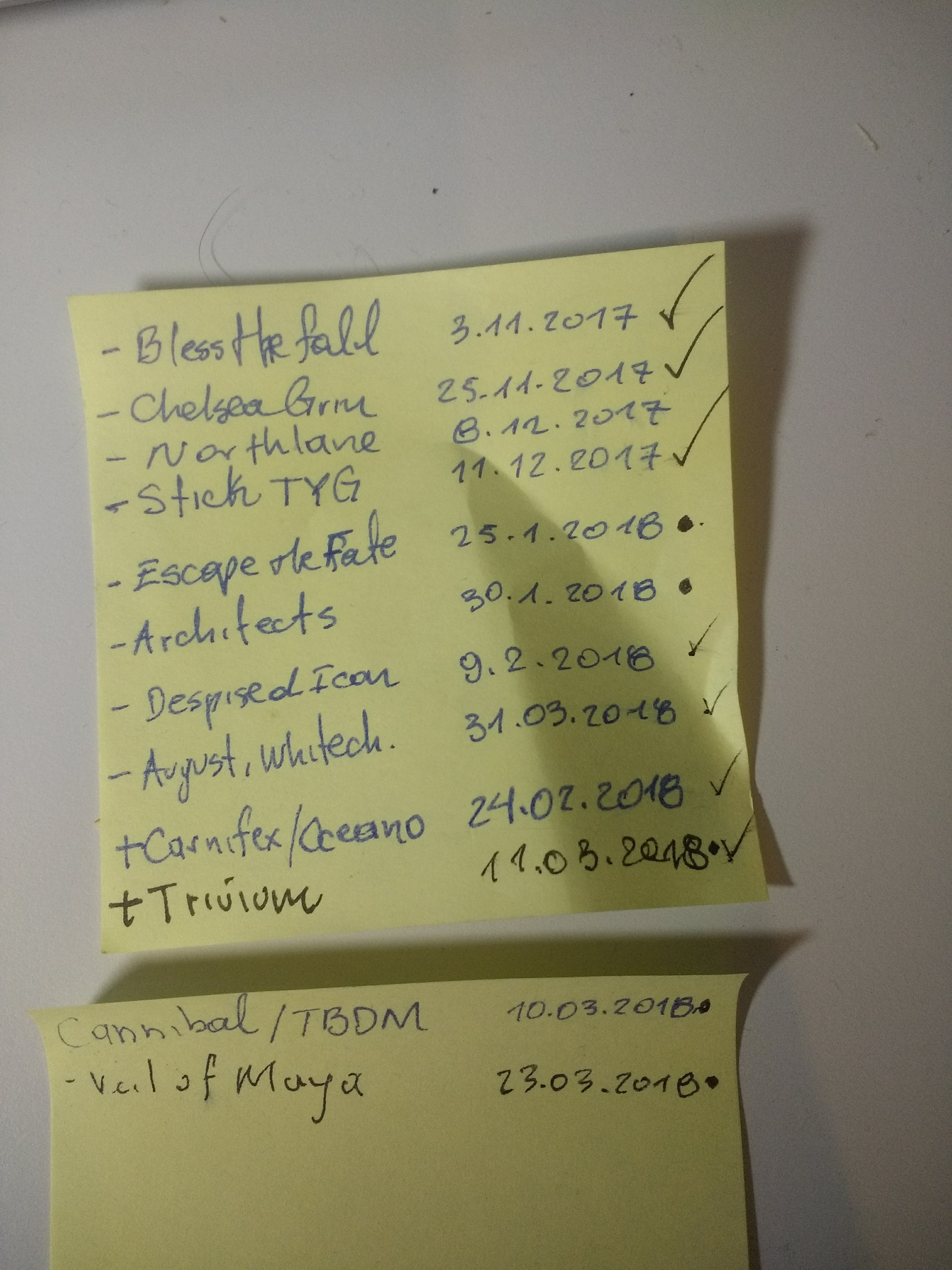 Esta es una lista de las bandas que quería ver mientras estaba en la maestría. Bueno, algunas de ellas. Si se dan cuenta, aquí solo son cuatro meses de los seis años que estuve en Alemania. Esta fue una temporada donde muchos artistas que me gustan decidieron ir a hacer tour en Europa. Para organizarme, tuve que aventarme esta pequeña wishlist e ir marcando los que asistí. Hubo uno al que no asistí y me arrepentí tiempo después: el de Cannibal Corpse con The Black Dahlia Murder. Ahora el vocalista de la segunda está muerto y ver a la primera banda no es sencillo. Tuve que tomar esta decisión porque tenía más ganas de ver a Trivium (un día después). Se nota que aproveché estos años para conocer a bandas que ya tenía escuchando casi una década, y no se diga cuando fui a ver a Rammstein en España. Muy linda época antes de la pandemia para ir a toquines.