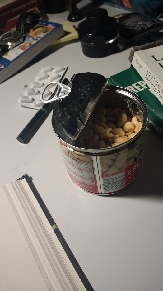 Esta es una pequeña parte de lo que era mi escritorio durante la maestría en Alemania. Hay varias cosas que notar. Lo que se enfoca son los cacahuates salados de los que viví por seis años. No recuerdo por qué tomé la foto, supongo que le estaba presumiendo a alguien mis botanas. A la derecha se aprecian los libros en los que andaba trabajando; física de partículas. Al fondo hay un tintero, porque me puse de mamila y comencé a usar pluma fuente (cosa que aún uso). Esta práctica es muy común en Germoney. Al fondo hay un reloj que me llevé de México sobre el primer manga de One Piece en Alemán. Este último lo compré para practicar el idioma, solo que nunca lo terminé. Finalmente, algo que no puede faltar, unos ibuprofenos de 400mg (lo legal sin receta) al alcance de la mano. En esos tiempos aún no lograba controlar mis dolores de espalda como hoy. Faltan varias cosas, pero fue lo que se alcanzó a capturar en la imagen. De nuevo, no recuerdo la razón de hacer esto aunque es lindo ver cómo tenía acomodado mi lugar de trabajo hace tantos años.