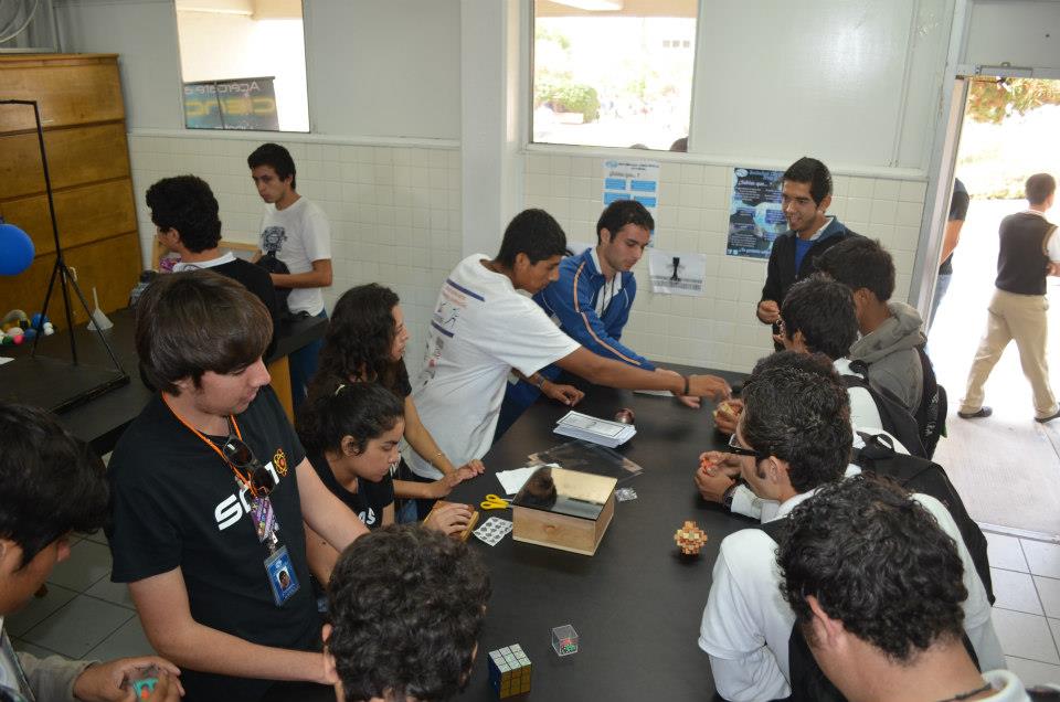 Una imagen de cuando hacía divulgación durante la Semana de Ciencias con la Sociedad Científica Juvenil. Dado que muchos de los miembros nos encontrábamos estudiando la carrera en la UABC, nos era sencillo utilizar ese evento para hacernos propagando. No solo hablábamos de nosotros, también llevábamos pequeños proyectos y juegos de habilidad mental (véase la foto). Hay que decir que era muy cansado, ya que este evento se realizaba casi toda la semana y no había descanso. Pero bueno, nos divertíamos mientras compartíamos algo de ciencia a la juventud de Ensenada. Me preguntó si habremos tenido éxito en acercarlos al lado del conocimiento durante estos eventos.