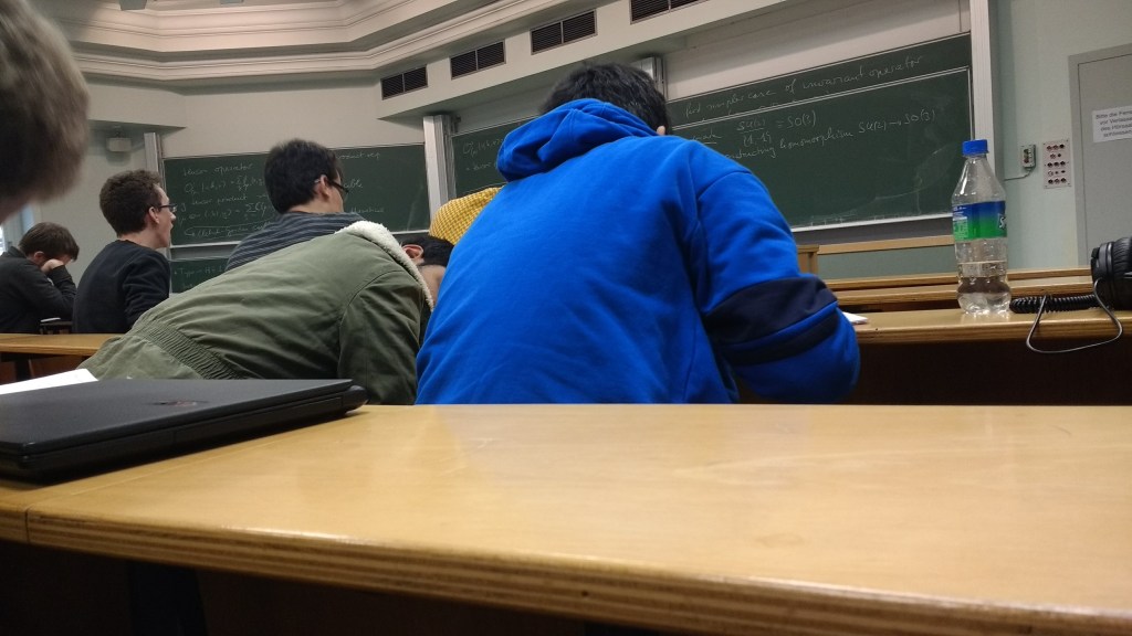 Esta es una foto que tomé durante una de las clases de Teoría de Grupos en Bonn, durante la maestría. Se puede ver a uno de mis compañeros durmiendo en lugar de estar poniendo atención. Resulta que este tipo tomo todo un año de cursos en un solo semestre y no le fue tan mal; así de pesado estaba. Frente a él, y un poco a la izquierda, están un par de colegas griegos, que resultaron ser muy buenos amigos durante buena parte de mi estadía. A su derecha está otro compañero, que le sufrió bastante en el primer semestre (casi como yo). Menciono a estos colegas porque todos ellos, y otra buena cantidad de amigos, “formamos” un grupo que consistía en juntarnos y tirar desmadre. Durante unos muy buenos y lindos años le seguimos, hasta que llegó el momento de cada quien tomar su camino. Afortunadamente no hemos perdido por completo el contacto. De hecho, en estos días estamos celebrando la primera reunión anual de dicho grupo, ya tras siete años de haber sido creado. Claro, todo en línea. Lo único que hacemos es revivir memorias y pasar viejos chismes. A ver qué deparan los siguientes años. Luego les cuento un poco sobre nosotros y las aventuras que vivimos.