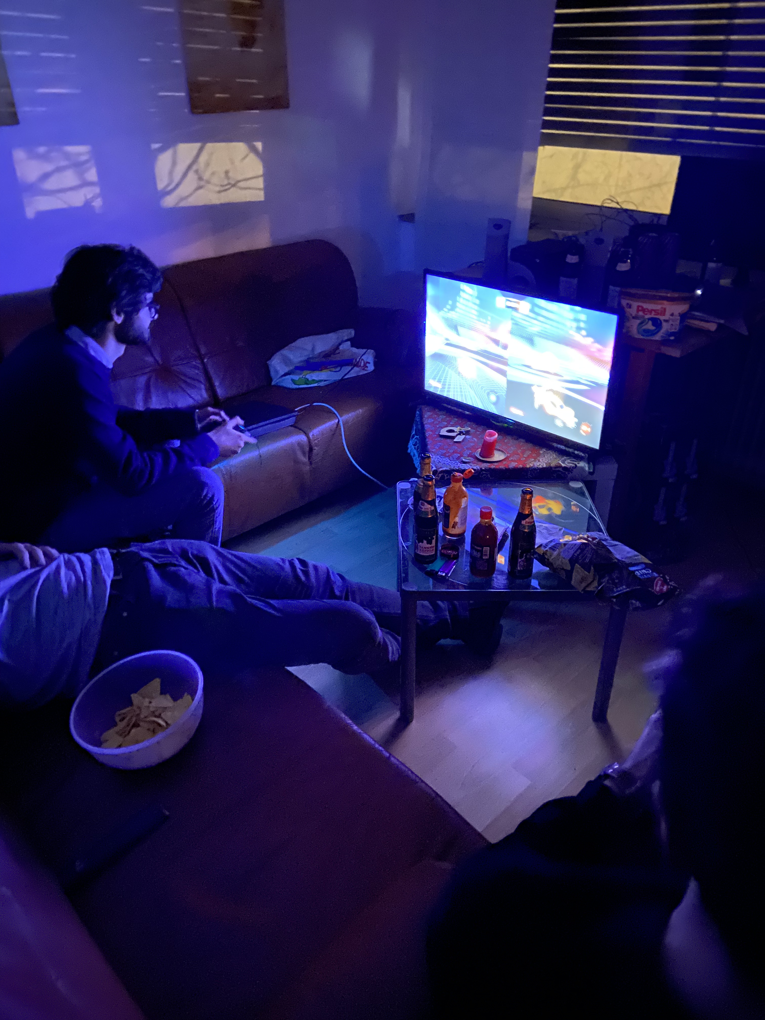 Siempre me ha gustado tener un espacio para recibir a las visitas. Cuando llegué a Bonn, tuve la fortuna de que me asignaran un depa con un cuarto relativamente grande. En una esquina acomodé un sillón pequeño y una mesita de Ikea; era el lugar para cotorrear con los cuates (esto se puede apreciar en el post Typischer Abend, donde está el tipo sentado volteando a la cámara). Poco antes de dejar el país, pude amarrar un buen depa con tres cuartos. Uno de ellos, el de la foto, lo asigné para las visitas. Aquí se ve cómo pasaba la mayoría de mis noches; con los compas jugando o viendo movies, mientras botaneábamos totopos con Valentina y nos pisteábamos unas Rothaus que compramos a la vuelta de la esquina. Mi objetivo ahora es tratar de replicar esto, pero en México. Claro, con nuevas personas para igual crear lindas memorias.