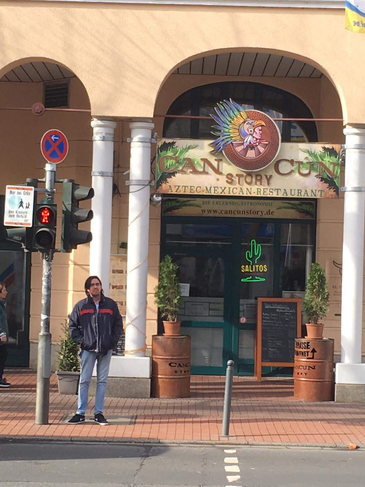 Un día un amigo me ganó a cruzar el semáforo y me tomó esta foto. Lo hizo porque siempre me estaba quejando del lugar que está en el fondo: un restaurante mexicano con temática Azteca-Maya. ¿Cómo funcionaba esto? Ni idea, nunca entré al lugar. Dado que cada que pasábamos por ahí les tocaba escuchar mi explicación, relacionaban mi nombre al de este establecimiento. Y bueno, esa es la corta de historia de mi rechazo por restaurantes alemanes con temática mexicana.