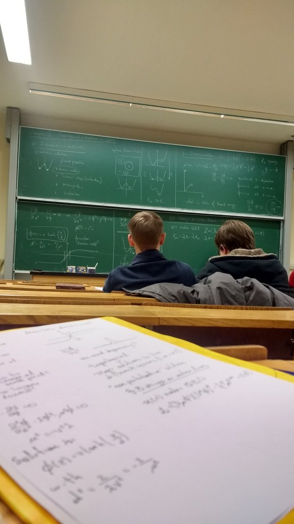 Era invierno en Alemania y hacía frío. Afortunadamente, los salones allá cuentan con sistema de calefacción, de otra manera no hubiéramos aguantado. En este rato el Prof. Dr. Nilles nos andaba platicando sobre el Spontaneous Symmetry Breaking, que es como un sistema toma la decisión de irse pa’ un lado o al otro de forma arbitraria. Piensa en el caso en que colocamos una pelota sobre una colina puntiaguda, como un sombrero mexicano, y la soltamos. ¿Para dónde se va la pelota, y por qué decide tomar ese camino en especial? (nada formal esta explicación, por cierto). Nunca había escuchado sobre esto, y se me hacía algo complicado de seguir. Hasta este punto del semestre ya era muy tarde para mí. Los temas que el profesor nos estaba platicando eran muy avanzados para el Johnny de hace siete años. Por fortuna un amigo, del grupo de los Buben, me ayudó bastante. De milagro pasé y pude seguirle al otro semestre con otra materia todavía más avanzada que hablaba de Supersimetría y esas cosas raras. En fin, me llamó la atención esta foto porque probablemente muy pronto me toqué impartir estos conocimientos a mis queridos alumnos. Ya veremos si le agarran a la primera a esto del Higgs potential y otros aspectos extraños de la física de partículas.