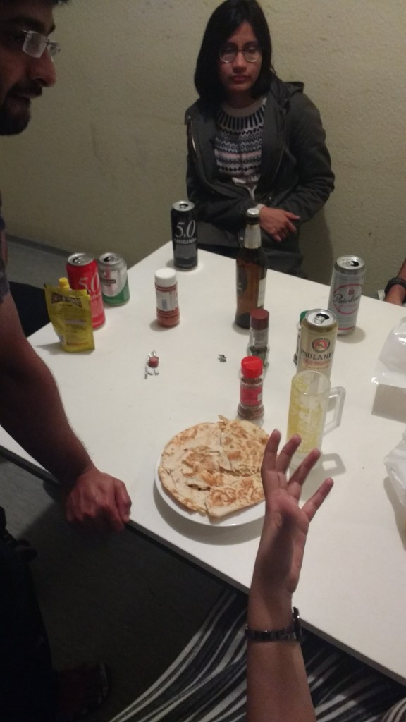 Esta es una de las veces que tocó hacer de comer en la peda. Tenía apenas unos meses en Bonn, y estaba poco a poco conociendo a los colegas de la maestría. Para tratar de impresionarlos con nuestros platillos, se me ocurrió preparar unas sincronizadas, que pueden ver en la imagen. Lamentablemente, no fue bien recibido por los amigos de la India. La verdad no recuerdo la razón, pero yo y mi otro compa mexicano nos terminamos comiendo todo. Supongo que la mezcla de queso con la “tortilla” no les pareció una buena idea. Esto lo comprendo, pues una vez me hicieron comer dulces con oro o plata. Sí, con metales encima. En fin, esta fue una de las muchas ocasiones donde cociné para la banda internacional, y la única donde fallé. Eso sí, pregúntenles por las salsas que me aventaba en las fiestas; eran los primeros en estar ahí campeando el plato con los totopos.