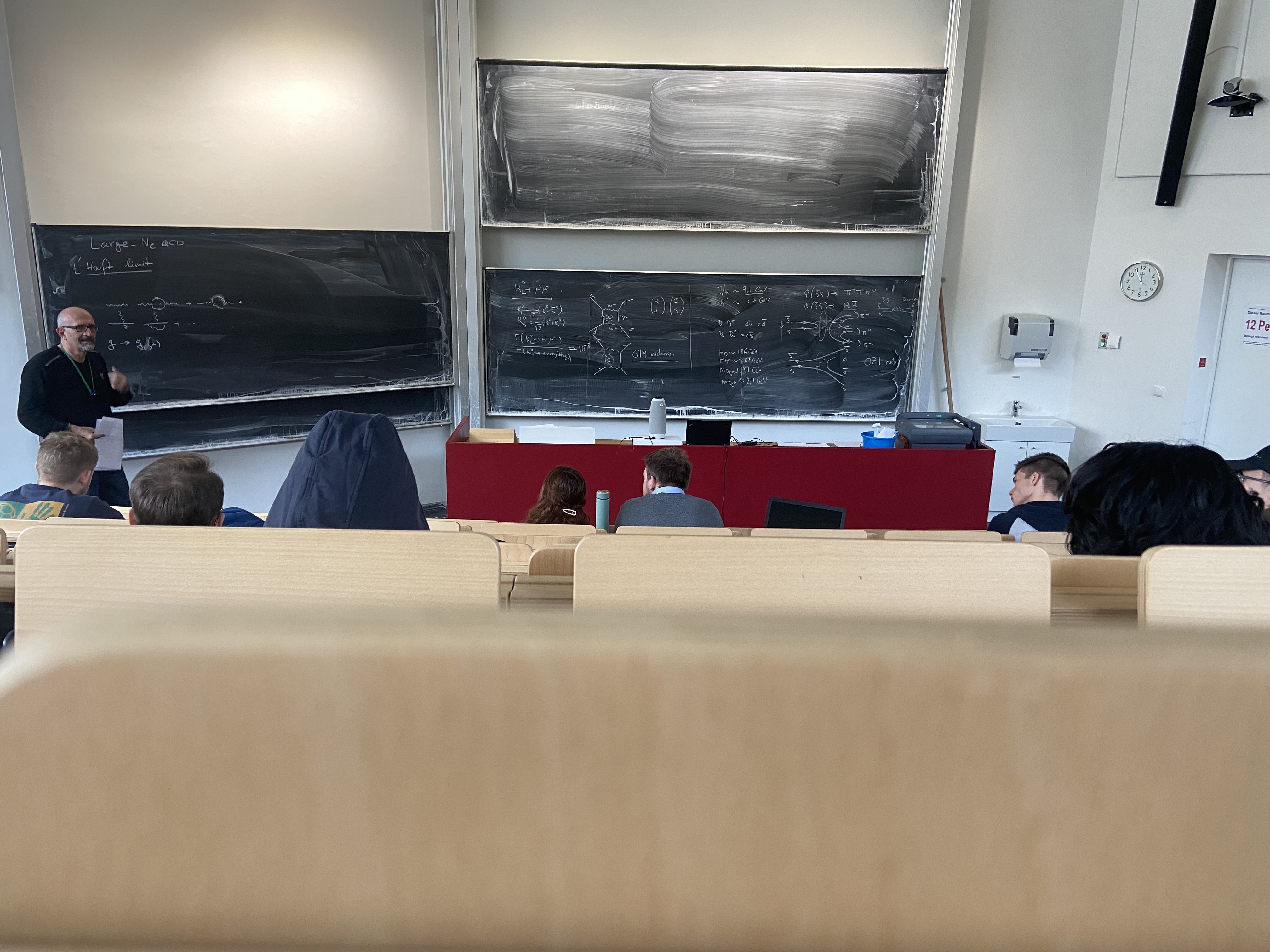 En algún punto de mi estadía con mi asesor, comencé a llamarle Jefe. Había veces que me saludaba diciendo “Hola” con su pesado acento georgiano, o me gritaba “Adiós” cuando nos despedíamos. Creo que por eso en los correos, y luego ya en persona, le decía de esta manera. Era también una muestra de respeto por mi parte, y de cierta forma aprecio por todo lo que me apoyó durante la maestría y el doctorado. En la imagen aparece dando una de las clases que fui tutor durante unos años; física de hadrones. Era una clase de tres horas, pero que fácilmente se la podía aventar sin pausas. Llegaba un punto donde te perdías en todos los cálculos y conceptos que ponía sobre el pizarrón, pero siempre respondía tus dudas si te atrevías a preguntar. De verdad le gusta dar clases y enseñar lo que conoce.