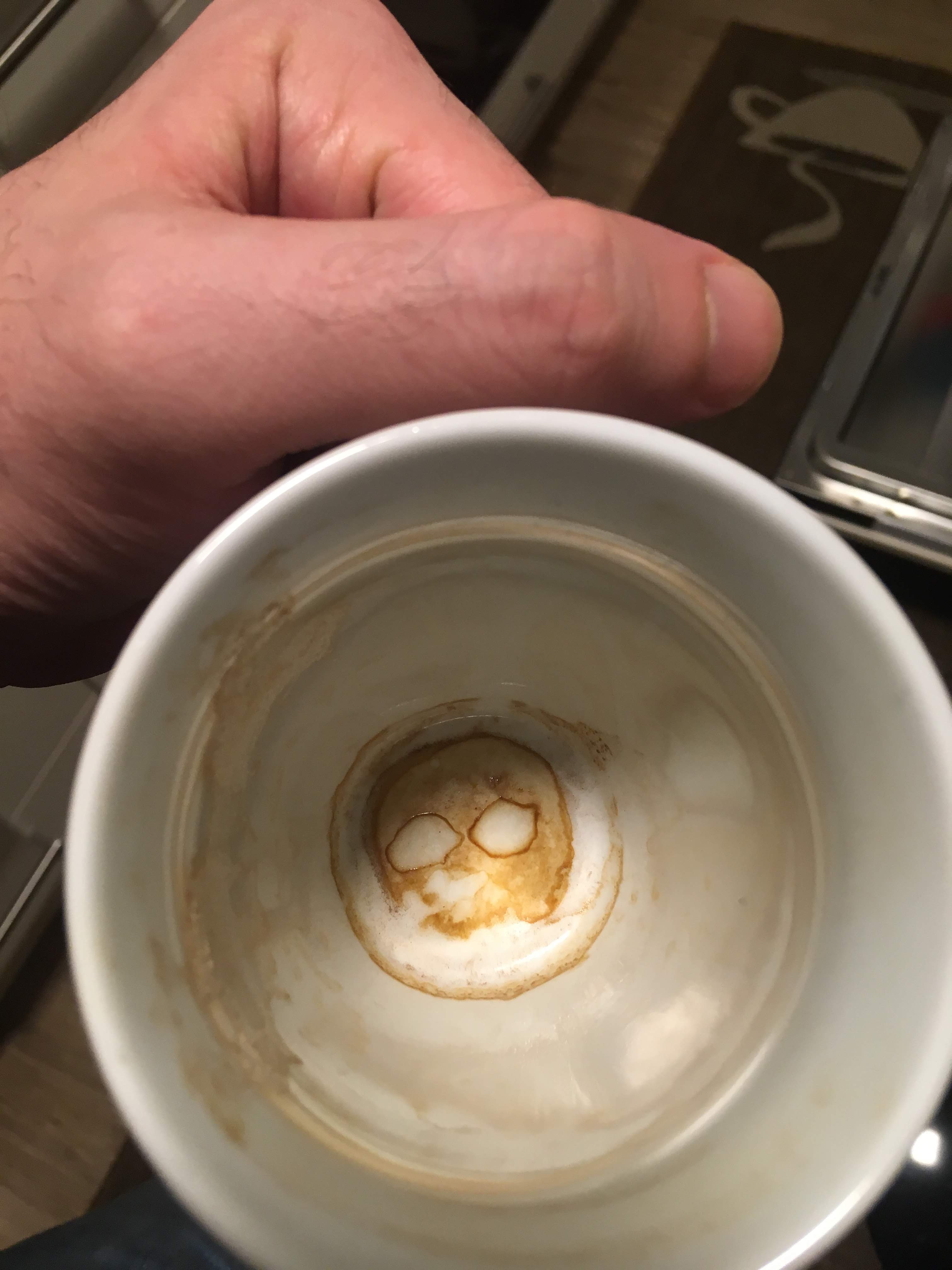 El último del año. Hace cinco años me encontraba celebrando las fiestas de Año Nuevo con los seres queridos. Recuerdo que estuvimos cotorreando un rato en el depa con el plan de quedarnos ahí, pero decidimos mejor, de última hora, irnos al centro de Bonn para ver la pirotecnia. Pocos minutos antes de la medianoche, andábamos por ahí corriendo para alcanzar un camión; y lo logramos. Llegamos justo a tiempo para ver todo el desmadre junto al río Rin, y regresamos al depa para seguir cotorreando un rato, y bajar un poco la peda. Para esto, me preparé (o me prepararon, no recuerdo bien) un café. Ya que me lo terminé, noté algo curioso al fondo de mi taza. Se me hizo interesante, y le tomé foto. Recuerdo que se la mostré a las personas que ahí estaban, y estuvieron de acuerdo conmigo. ¿Qué ven ustedes? Hay gente que se dedica a leer los remanentes de bebidas, me pregunto qué dirían de la mía.