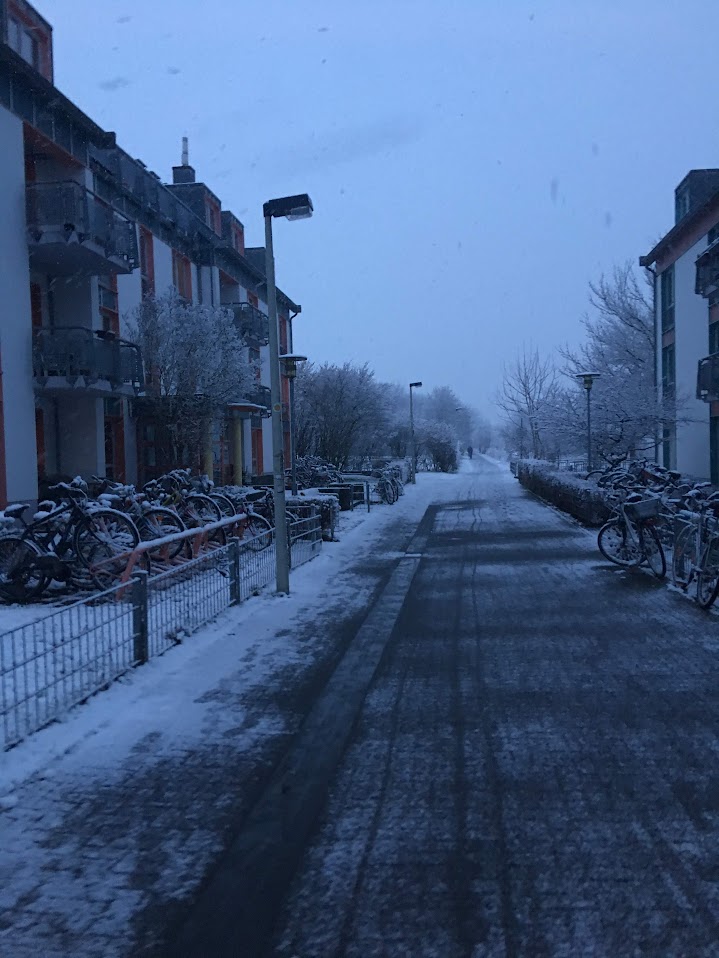 Alemania es relativamente famoso por sus fríos y duros inviernos. Por fortuna, me tocó vivir en una ciudad en la que apenas nevaba. Por esta razón, son contadas las veces que me tocó ver algo de nieve en la calle. Un ejemplo, en esta foto pueden ver que estuvo cayendo algo de nieve durante el día, pero tampoco fue en exceso; la parte en la que camina la gente ya casi no queda. Esta imagen la tomé justo afuera del dormitorio donde viví algunos años: BKW. Me llamó la atención porque era una experiencia que no se vivía cada invierno, como en otras regiones del país. Otra cosa que se puede observar son las marcas que dejan las bicicletas. Resulta que ningún tipo de clima detiene al alemán cuando se trata de utilizar su medio de transporte favorito. En fin, no soy muy fan de la nieve, así que tuve suerte de terminar en Bonn. La primera vez que me tocó experimentar con la nieve fue aquí mismo, justo a un lado del edificio de la izquierda (casi me rompo la rodilla). Algunos de estos momentos los compartí en este post.