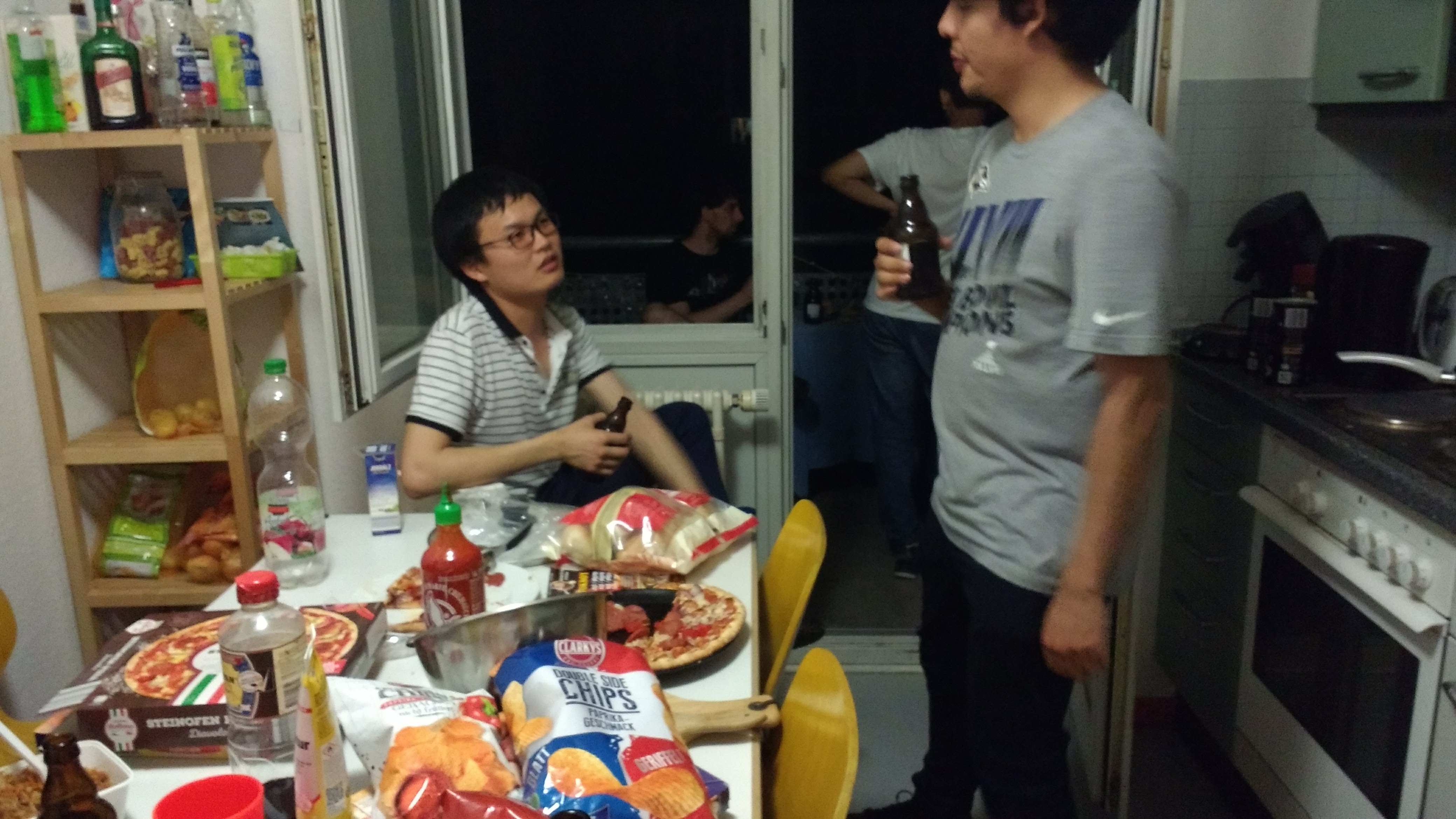 Ya era de madrugada y comenzaba a pegar el hambre después de estar cotorreando tantas horas. Bueno, creo que el consumo de alcohol también tuvo mucho que ver para que nos diera hambre. Como pueden ver, hay algo de comida sobre la mesa: bolsas de papitas, pizzas y una bolsa con pan para preparar en el horno. Es evidente que después de cierta hora la comida comenzaba a escasear, junto con las cervezas. Esta es la forma más común para que se te muera la fiesta. Es eso o correrlos. Por lo general, nuestras fiestas terminaban por la primera razón. Es por eso que había que prepararse bien antes del cotorreo; con bastante combustible para mantener viva la fiesta lo más posible. De otra forma, corrías el riesgo de que tus colegas se comieran tu despensa. Esta es una actividad que realicé en varias ocasiones, y de la que fui víctima incontables veces. En realidad hay otra forma de que muera la fiesta, que también nos llegó a suceder, pero quizá se las cuente en otra ocasión.