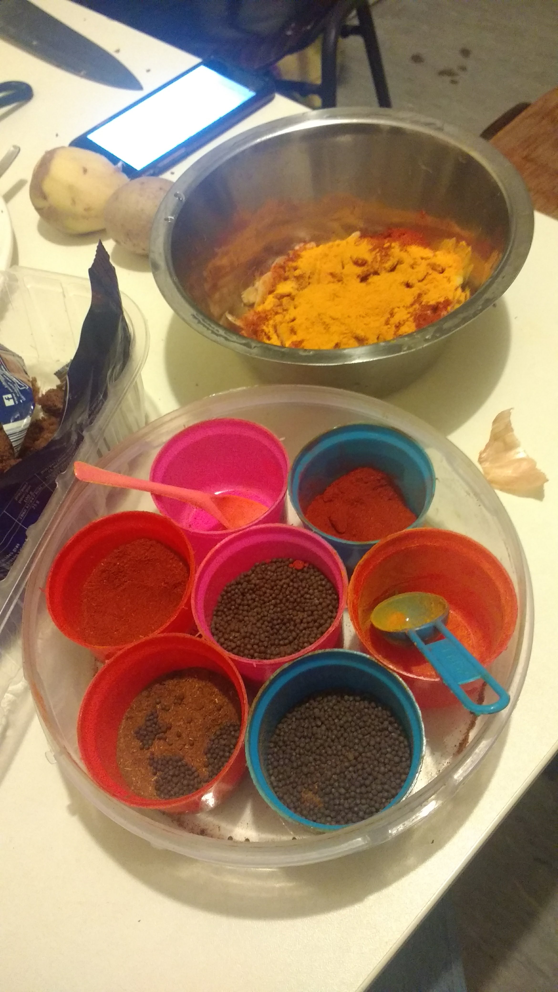 Un día los colegas indios (de la India, pues) nos invitaron a donde la mayoría estaba viviendo, y se pusieron a cocinar. Para mi sorpresa, alguien saco esta charola con cosas coloridas. Pensé que iban a maquillarse o algo por el estilo, pero resulta que es lo que usan de a diario para preparar sus platillos. Al final ya no recuerdo qué terminé comiendo, solo que tenía un sabor muy peculiar que nunca había probado y que quizá nunca vuelva a probar, a menos que me aviente un viaje por allá. De cualquier forma, si se topan un restaurante indio se los recomiendo; sí cocinan chido.