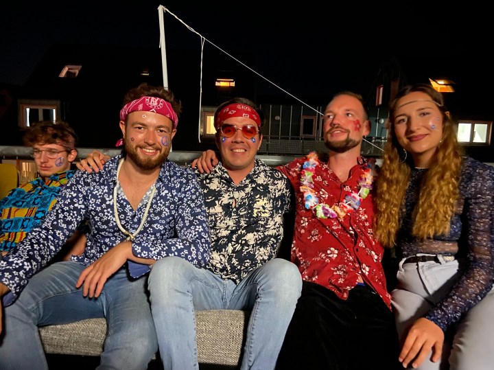 Esta creo que fue la última vez donde los cuatro originales del BKW estuvimos juntos. Ya habían pasado unos años desde que nos salimos del depa, pero las fiestas continuaban en el edificio por otro cuate que se quedó tiempo extra viviendo ahí. Recuerdo que no tenía muchas ganas de ir porque no tenía algo que ponerme, pero mis roomies me echaron la mano y me prestaron algo de ropa. A la izquierda sale otro compa que también se la vivía ahí con nosotros, un amigo de la infancia del de azul. Seguramente lo han visto en otras fotos que he subido durante estos años. De hecho, esta foto la tomaron frente al edificio donde nos tocó vivir; es uno idéntico al nuestro, solo que reflejado. No me tocó conocer mucho a la gente de ahí, solo iba a las fiestas que se hacían en el bar del sótano. Pues bueno, breve comentario sobre la corta interacción que tuvimos en nuestra (quizá) última reunión. A ver si en algún punto en el futuro nos volvemos a encontrar todos.